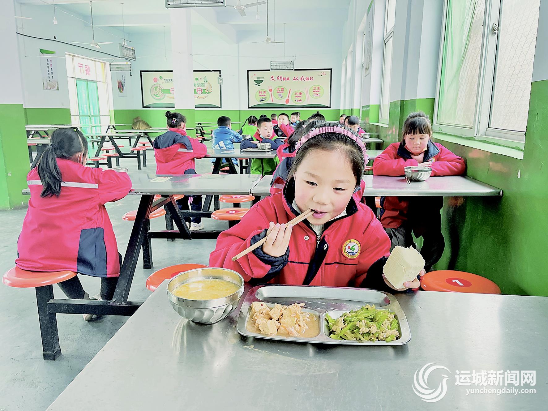 芹菜炒鸡蛋、冬瓜炖肉、南瓜小米粥……3月17日9点30分,清脆的下课铃声响后,盐湖区上王中心学校的113名学生分批就餐、间隔就座。热气腾腾的美味菜肴,让有的学生忍不住多添了一个馒头。