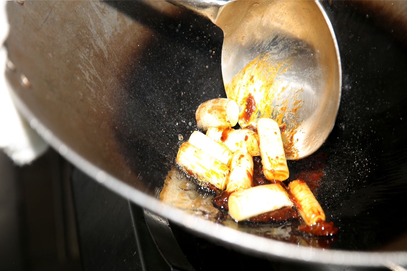 开火,热锅,倒油,先将葱段下锅,紧接着放入片好的黄玉参,大火,爆炒。
