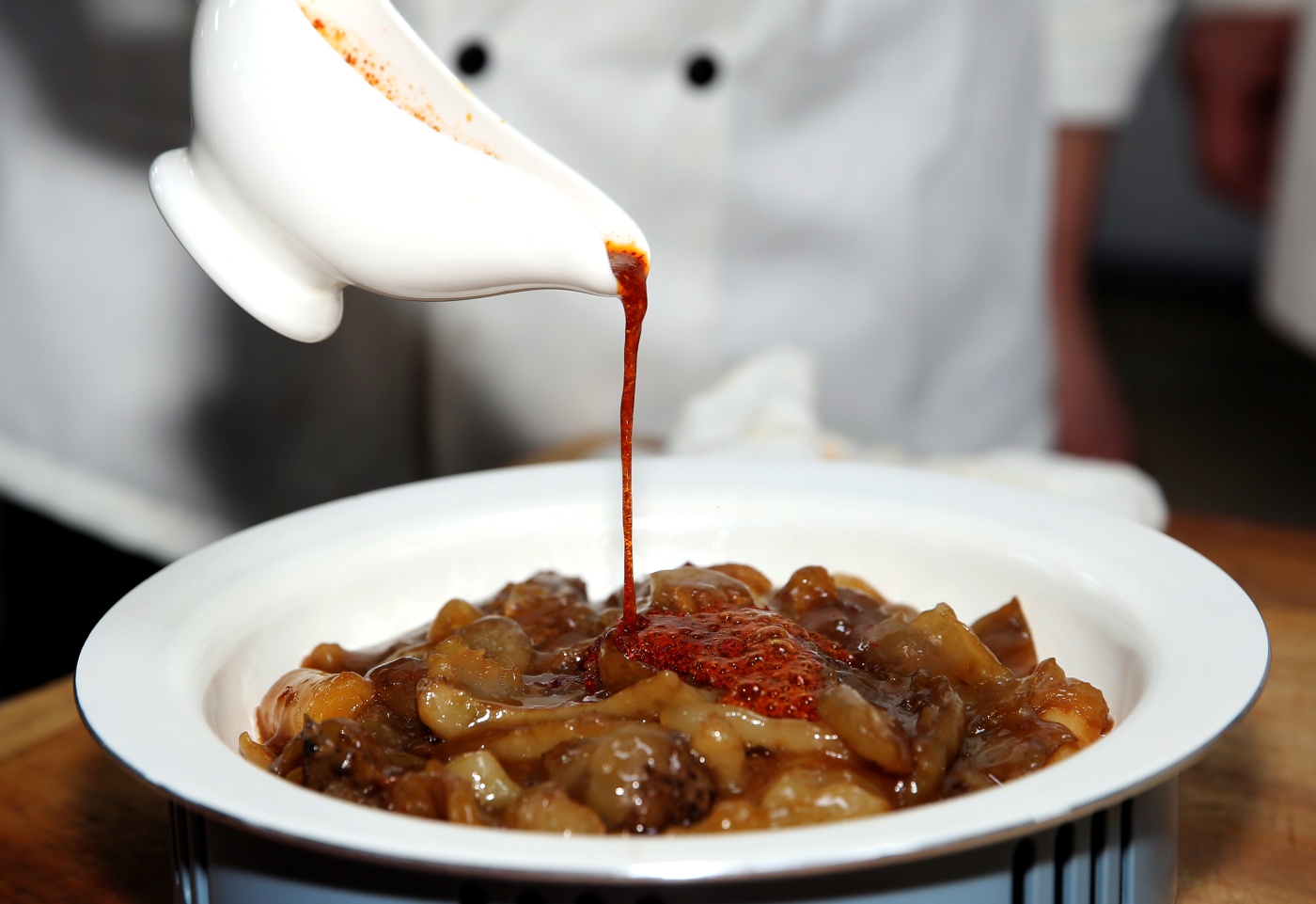 将炒好的海参盛盘,倒入红辣椒面,然后用滚烫的热油一泼。顿时,一阵“嗞啦”声迅速入耳,与此同时,海参独有的香气迎面扑来。