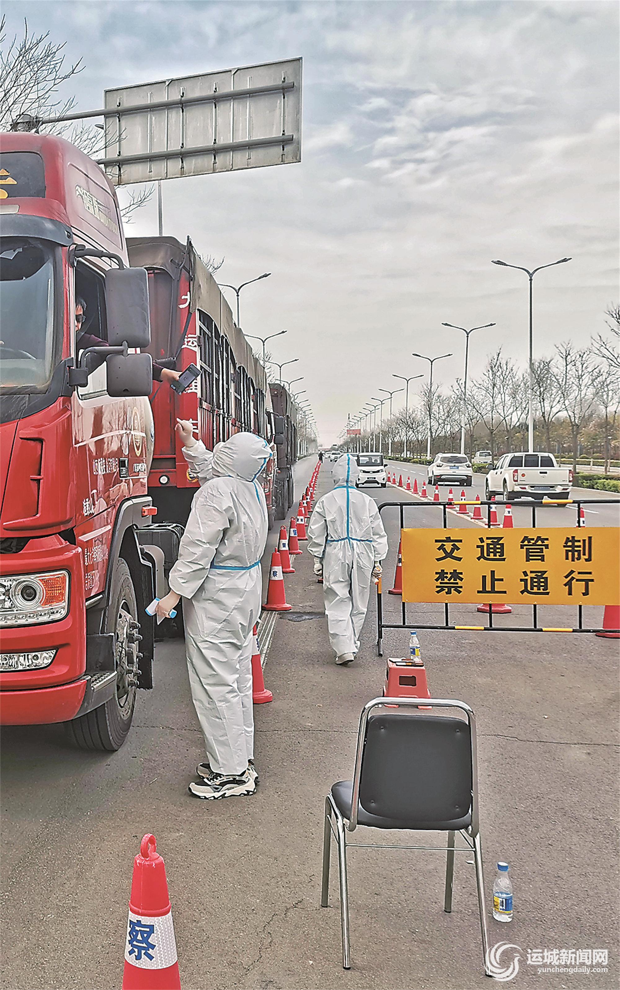▲3月24日,临猗县公安、交通、卫健等部门工作人员,在县城五一路北交通卡口对过往车辆进行检查。