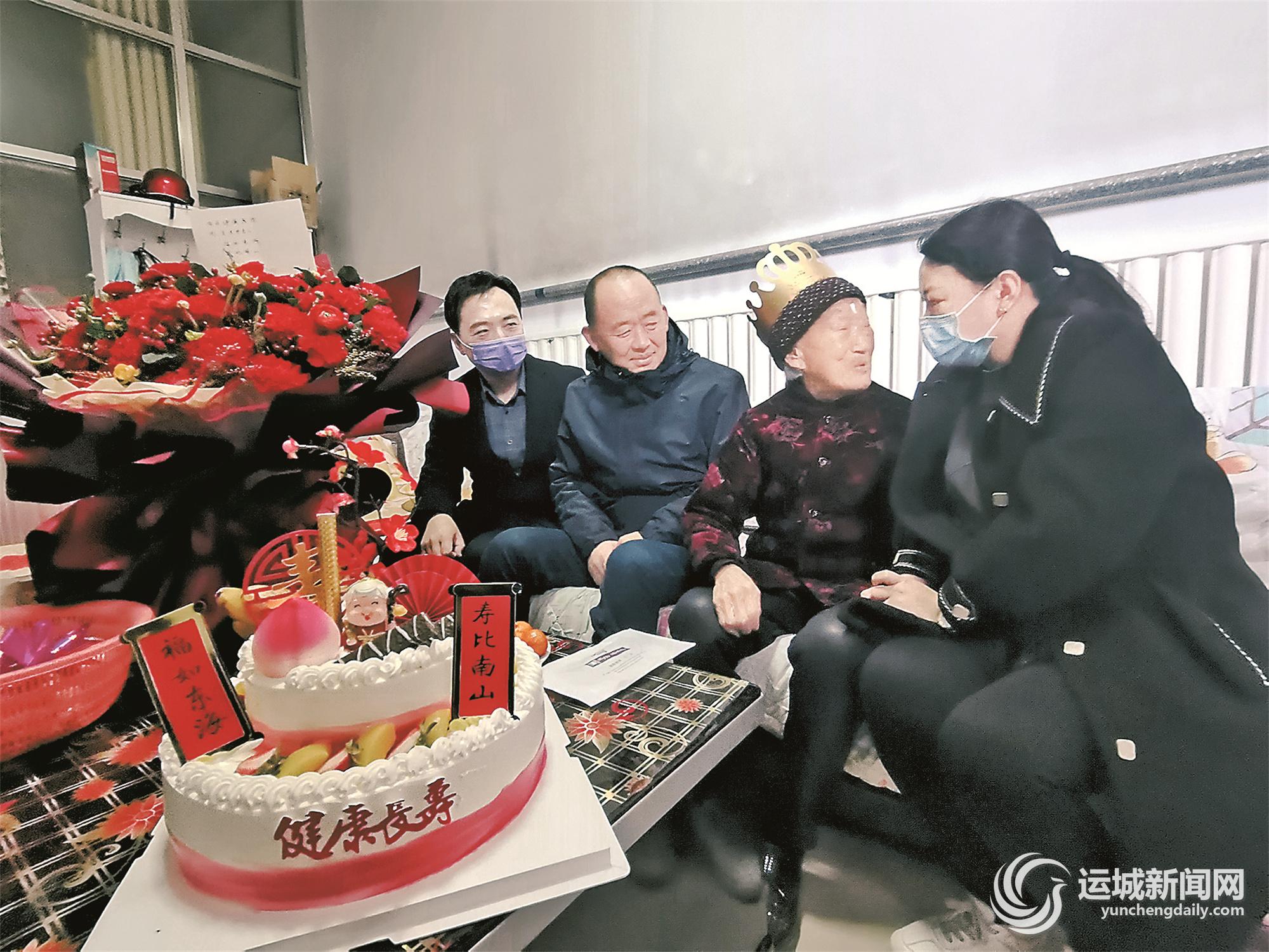 3月24日,是绛县郝庄乡永青村王玉秀老人的108岁生日。让老人没有想到的是,当天上午9时许,绛县健康医院院长王全民带着骨科主任张磊、护士长谢保红,与郝庄乡卫生院院长王红卫一起来给她过生日,送上蛋糕和108朵郁金香,祝愿老人福如东海、寿比南山。