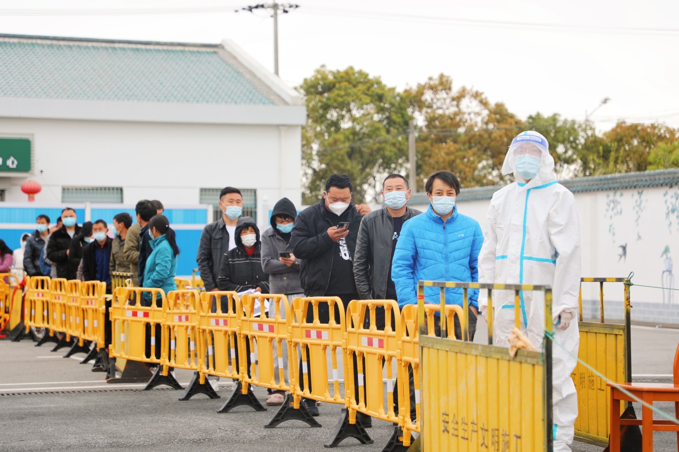 3月28日,上海市奉贤区西渡街道益民村的居民排队等待核酸采样。 3月28日5时起,上海市以黄浦江为界分区分批实施核酸筛查。第一批,浦东、浦南及毗邻区域先行实施封控,开展核酸筛查,4月1日5时解封。同时,浦西地区重点区域继续实施封控管理。第二批,4月1日3时起,按照压茬推进的原则,对浦西地区实施封控,开展核酸筛查,4月5日3时解封。