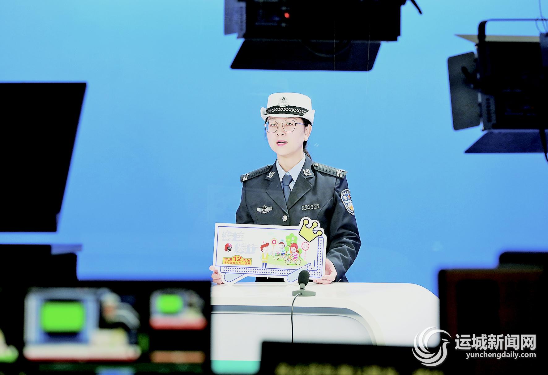 ▲3月25日,宣传民警在当地电视台录播室录制中小学生交通安全日线上课堂。