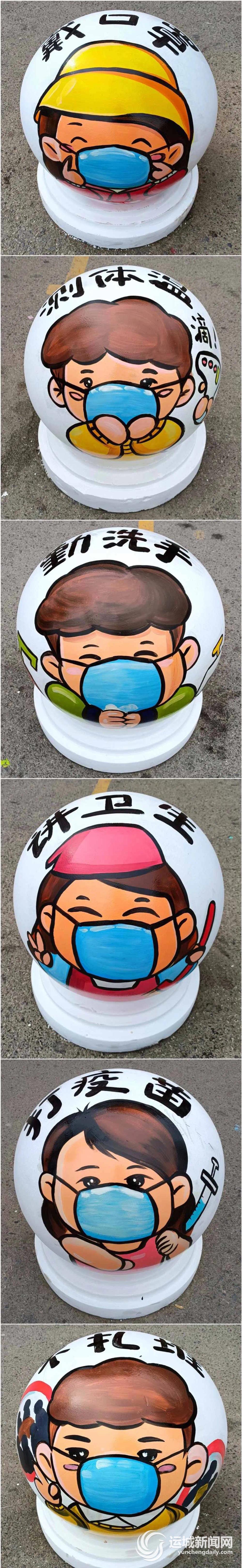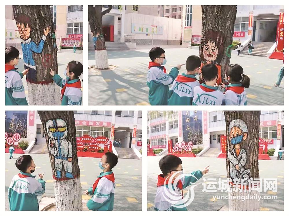 近几天,夏县新建路小学的师生惊喜地发现:校门口普普通通的隔离墩,变身成一个个戴口罩的胖娃娃;中院里的大柳树,竟“站”上一个个“白衣战士”,每天走过的水泥路面,也被色彩艳丽的小姑娘“占领”……彩绘在校园勾画的别样风景,令同学们纷纷驻足观赏,轻松愉快地学到了防疫知识。
