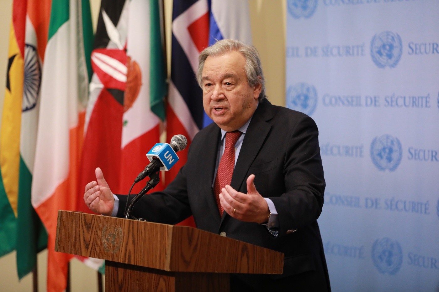 3月28日,在位于纽约的联合国总部,联合国秘书长古特雷斯在记者见面会上讲话。联合国秘书长古特雷斯28日呼吁有关方在乌克兰立即实施人道主义停火。