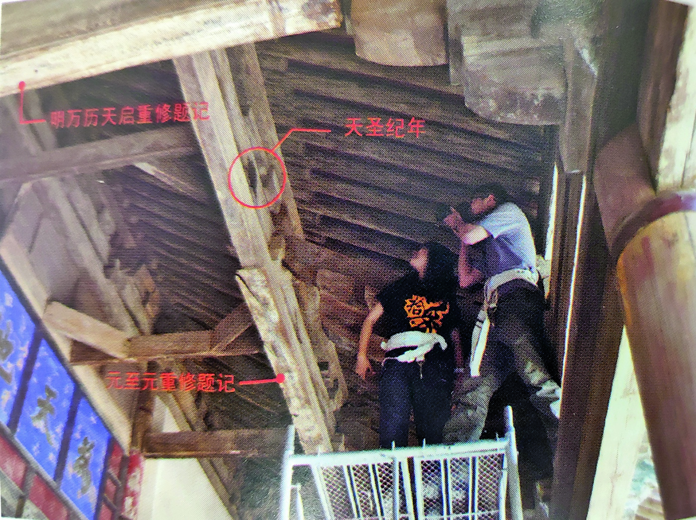 按以前形制研究的结论,万荣稷王庙大殿原构形制的年代下限为北宋熙宁年间。根据木作材料树种的研究结论,万荣稷王庙大殿的原构时代符合北宋中前期建筑的特点。因而,课题组在测绘期间于原构构件上发现的北宋天圣纪年,可与前期所进行的形制和材料研究结论形成互证关系,为更精确地确认万荣稷王庙大殿的年代提供了可靠而珍贵的史料依据。