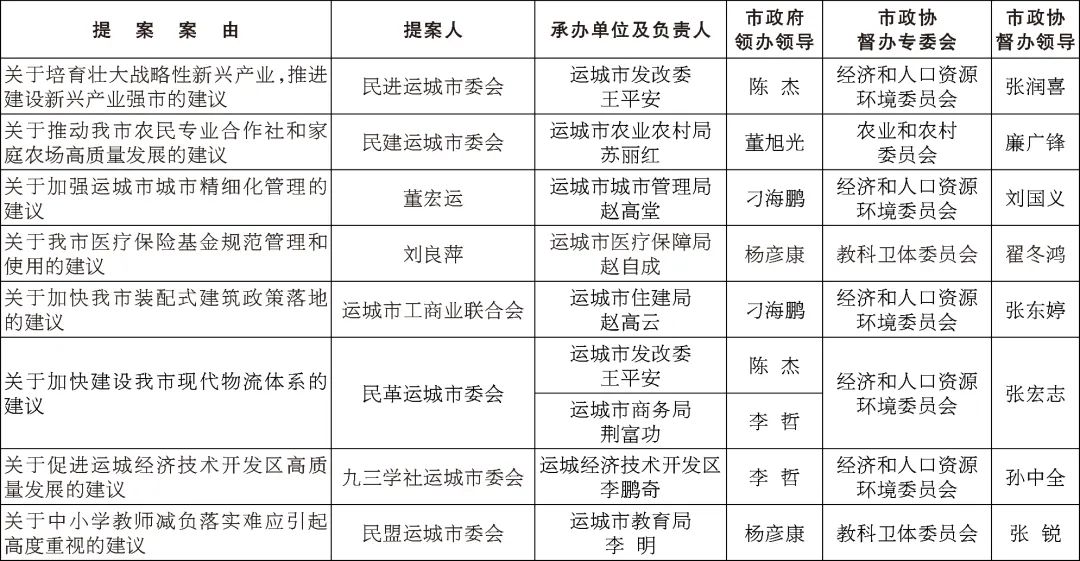中国人民政治协商会议第五届运城市委员会第一次会议期间,市政协委员、政协各参加单位和各专门委员会,坚持以习近平新时代中国特色社会主义思想为指导,全面贯彻中共十九大和十九届历次全会精神,全面贯彻落实习近平总书记考察调研山西重要指示精神,认真贯彻落实省第十二次党代会、市第五次党代会和市委五届二次全会暨市委经济工作会议精神,以“五抓一优一促”为经济工作主抓手,围绕“一区两城三强市三高地”发展目标,立足新发展阶段,贯彻新发展理念,助力全方位推动高质量发展,积极通过提案建言资政,共提出提案480件。为了进一步加大委员提案的办理力度,提高提案办理质量,市政协主席会议将其中8件提案确定为重点提案。现将这8件重点提案的提案内容、提案者、承办单位、领办领导、督办机构和督办领导向社会公示,请各位市政协委员和广大人民群众监督。