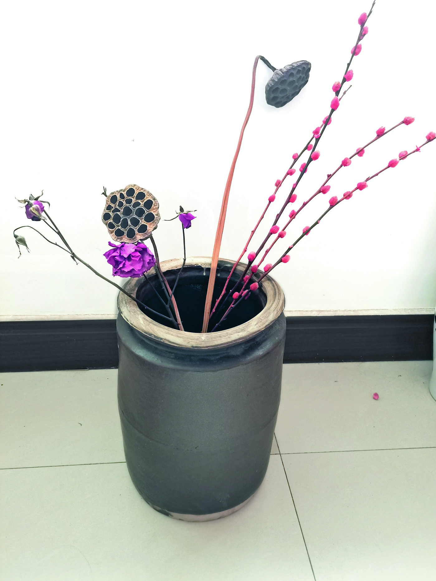 回到家,笔者把那个三尺高的粗瓷罐放到了阳台上,插上了几根干枯的莲蓬,阳台的角落一下子独成景致,把笔者之前的那个细瓷罐比下去了。老物件的魅力在于时间的沉淀之美,虽然这陶罐粗糙却别有韵味。