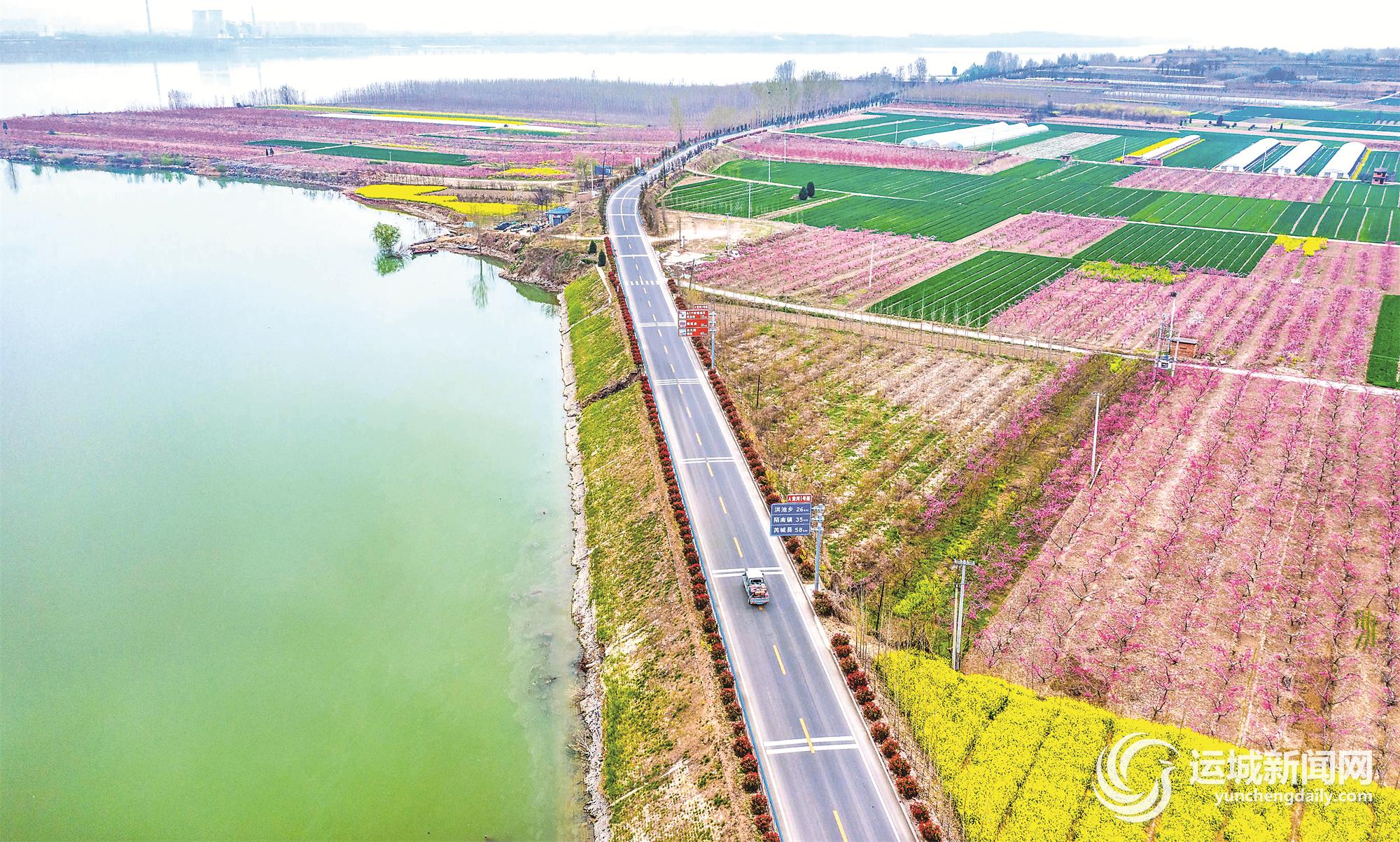3月30日,在平陆县境内拍摄的黄河一号旅游公路,路两旁繁花似锦,美不胜收。