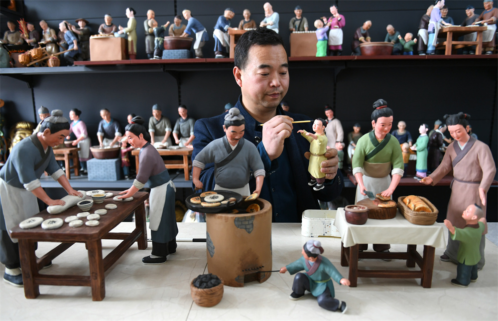 3月23日,省级非物质文化遗产“泥塑”传承人、稷山县翟店镇太郝村民间泥塑艺人梁宏志创作“稷山饼子”泥塑作品。