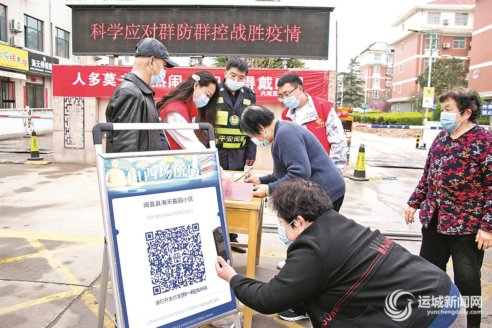 3月30日,闻喜县兴闻西街社区居委会工作人员,在辖区海天嘉苑小区对出入人员进行登记、测体温、查验行程卡和健康码。