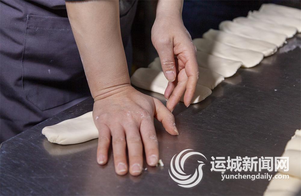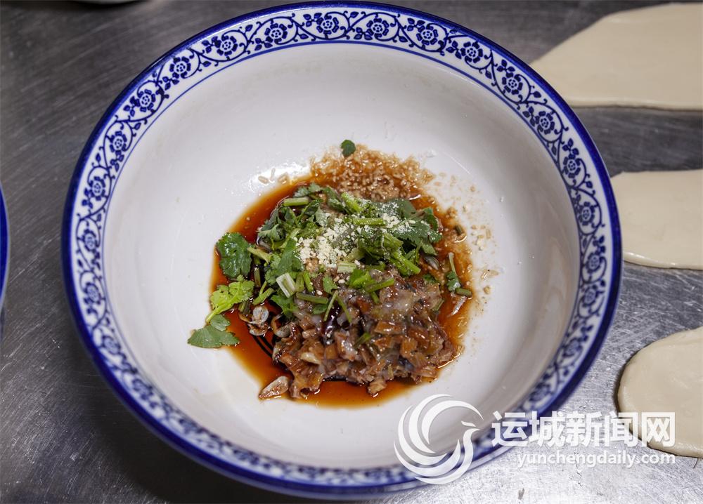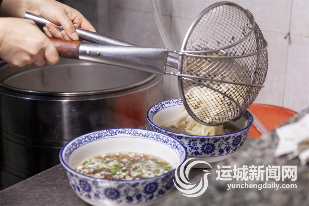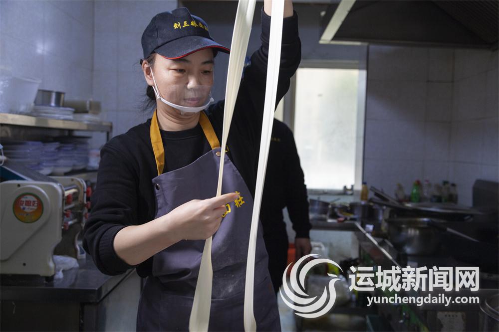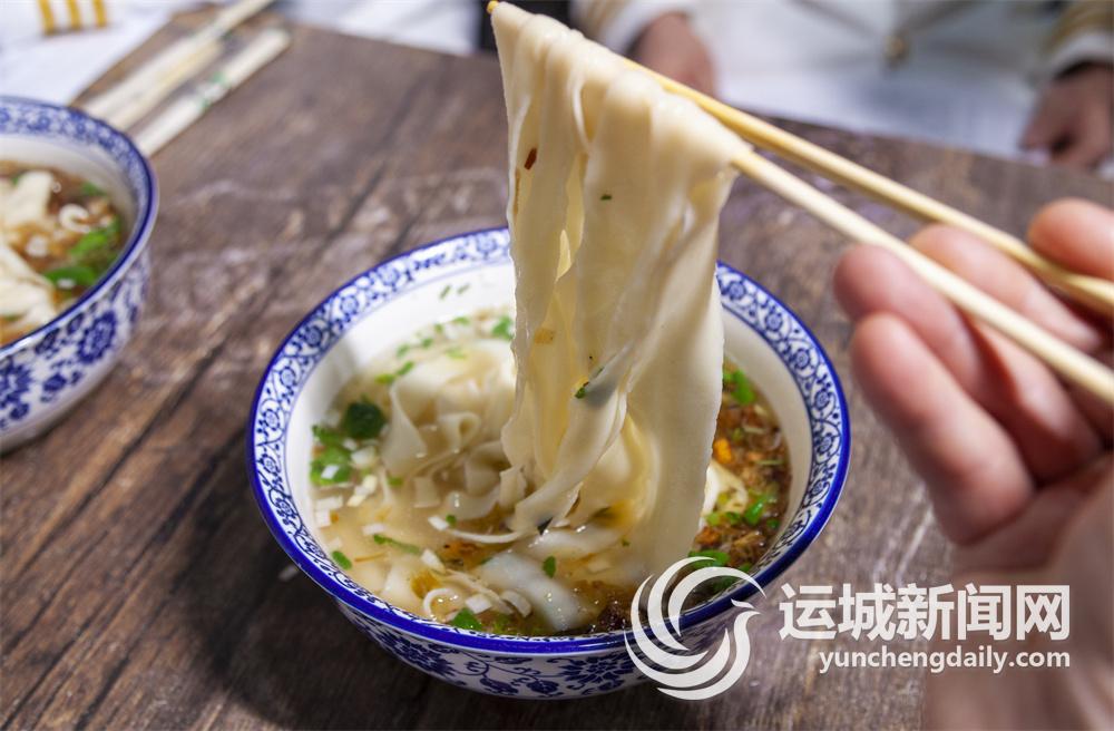 在市区信合名都小区南门附近的晋味源永济面馆,扯面师傅把面团擀成长条,压上三道褶,双手来回拉上几次,拉到一米多长时,顺着中间的褶印扯成三道,最后“啪”的一声在案板上摔出响声,面条就飞向沸腾的锅里。扯面师傅动作一气呵成,不拖泥带水。面条在锅里滚上两滚,就可捞出放到已经配制好的汤碗里。