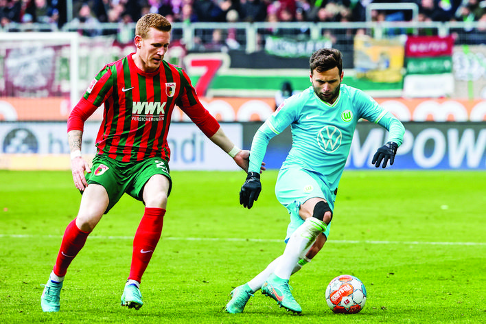 4月3日,沃尔夫斯堡队球员斯蒂芬(右)在奥格斯堡队球员哈恩的防守下控球。当日,在德国足球甲级联赛第28轮比赛中,奥格斯堡队主场以3比0战胜沃尔夫斯堡队。