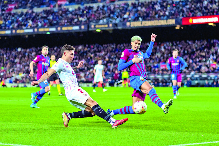 4月3日,巴塞罗那队球员阿劳霍(右)与塞维利亚队球员蒙铁尔在比赛中拼抢。当日,在2021~2022赛季西班牙足球甲级联赛第30轮比赛中,巴塞罗那队主场以1比0战胜塞维利亚队。