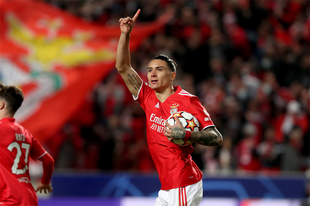 ▲4月5日,本菲卡队球员努内兹在比赛中庆祝进球。当日,在葡萄牙里斯本举行的2021~2022赛季欧洲足球冠军联赛四分之一决赛首回合比赛中,英超利物浦队以3比1战胜葡超本菲卡队。 新华社发(佩德罗·菲乌萨 摄)