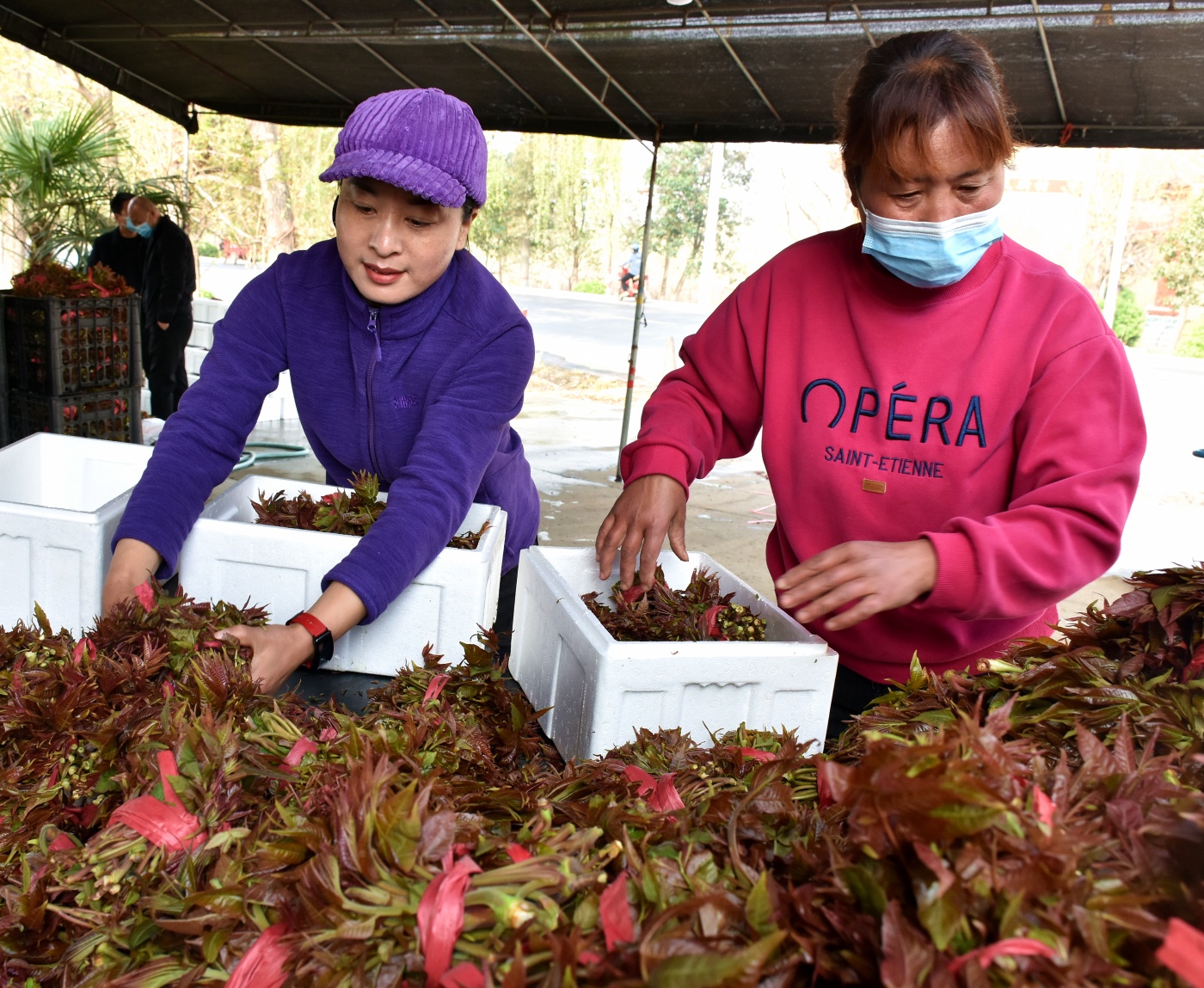 4月1日,永济市韩阳镇益农合作社员工,在分检刚采摘的香椿。