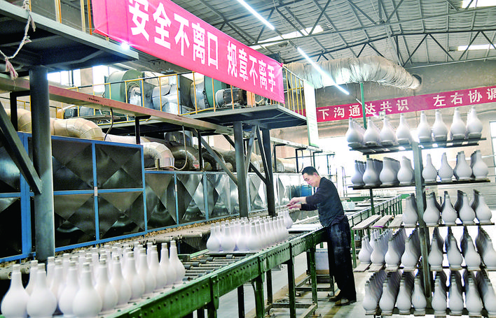 近日,在闻喜县华隆瓷业有限公司,车间工人在精心生产陶瓷酒瓶。今年以来,该公司在做好疫情防控工作的基础上,积极开展“安全不离口、规章不离手”安全生产活动,从车间、班组到每个工人,确保规章制度落实到位,保障各项经济指标如期完成。 特约摄影 温徐旺 摄