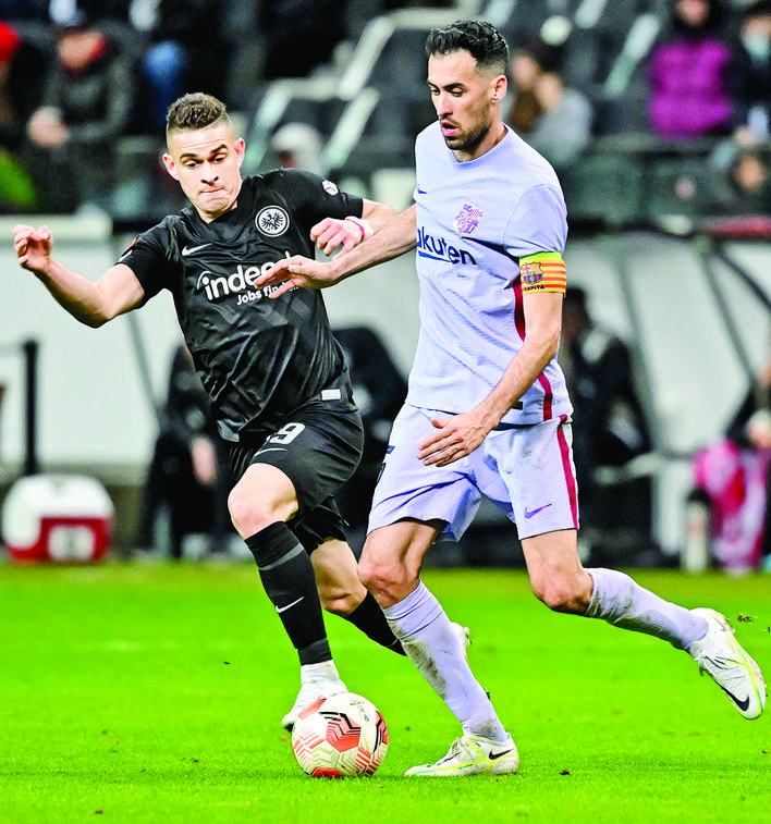▲4月7日,巴塞罗那队球员布斯克茨(右)在比赛中与法兰克福队球员博雷拼抢。当日,在德国法兰克福举行的2021~2022赛季欧罗巴联赛四分之一决赛首回合赛中,西甲巴塞罗那队客场以1比1战平德甲法兰克福队。新华社发(乌尔里希·胡夫纳格尔 摄)