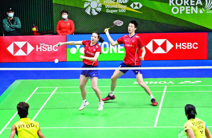 ▲4月7日,中国组合欧烜屹/黄雅琼(左)在比赛中。当日,在韩国顺天举行的2022年世界羽联巡回赛韩国公开赛混双第二轮比赛中,中国组合欧烜屹/黄雅琼以2比1战胜印度组合雷迪/蓬纳帕,晋级下一轮。 新华社发(李相浩 摄)