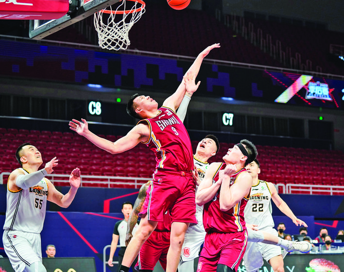 ▲4月7日,山西汾酒股份队球员闫鹏飞(左二)在比赛中争抢篮板球。 当日,在江西南昌举行的2021~2022赛季中国男子篮球职业联赛(CBA)季后赛第二轮首回合比赛中,辽宁本钢队以116比104战胜山西汾酒股份队。 新华社记者 胡晨欢 摄