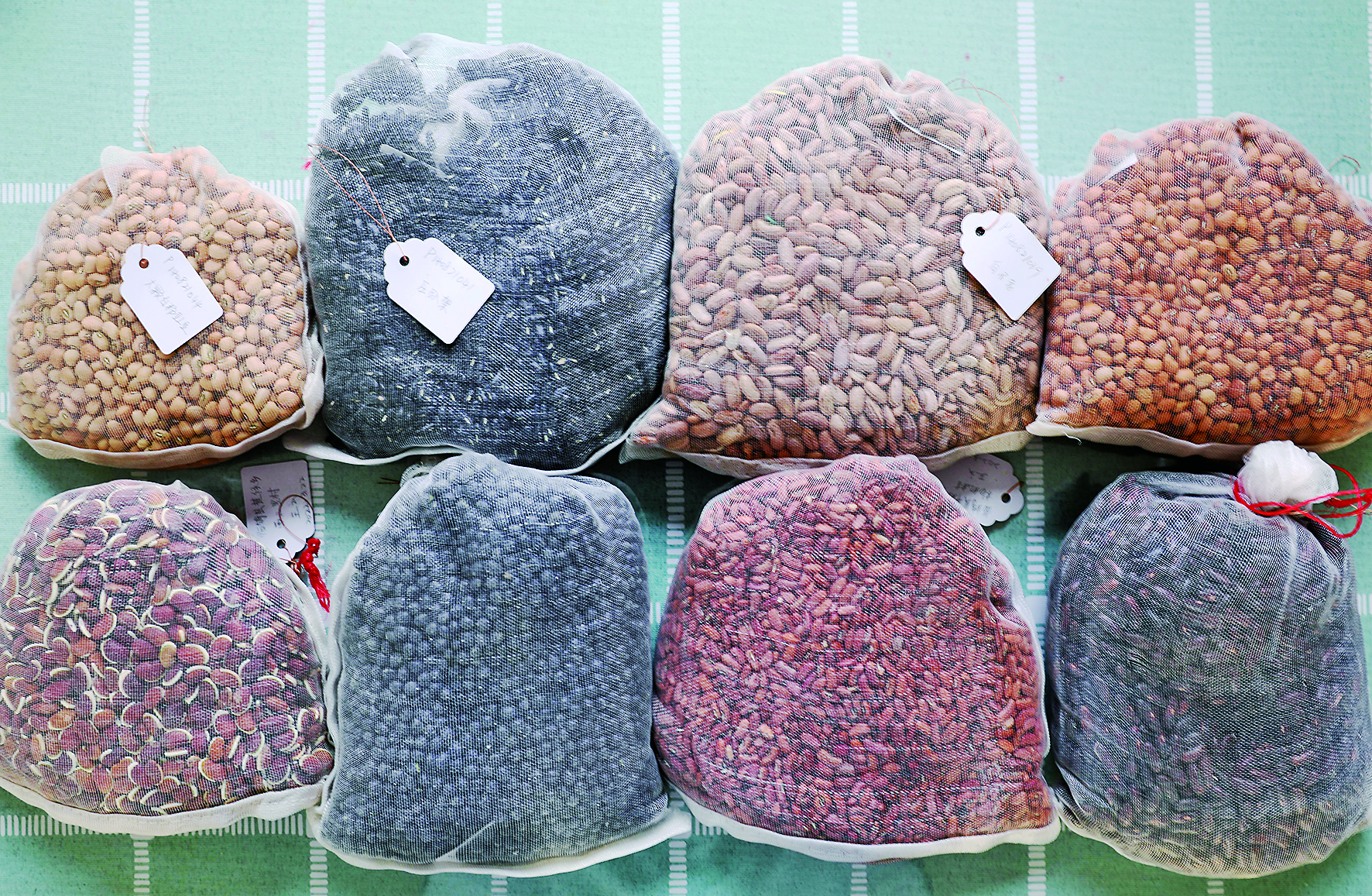 一个个透明袋子里,装着约一二斤的种子。绑口处的一个小吊牌标签上,记录着这袋种质资源的相关情况,有编号、地域、时间、采集人员姓名。