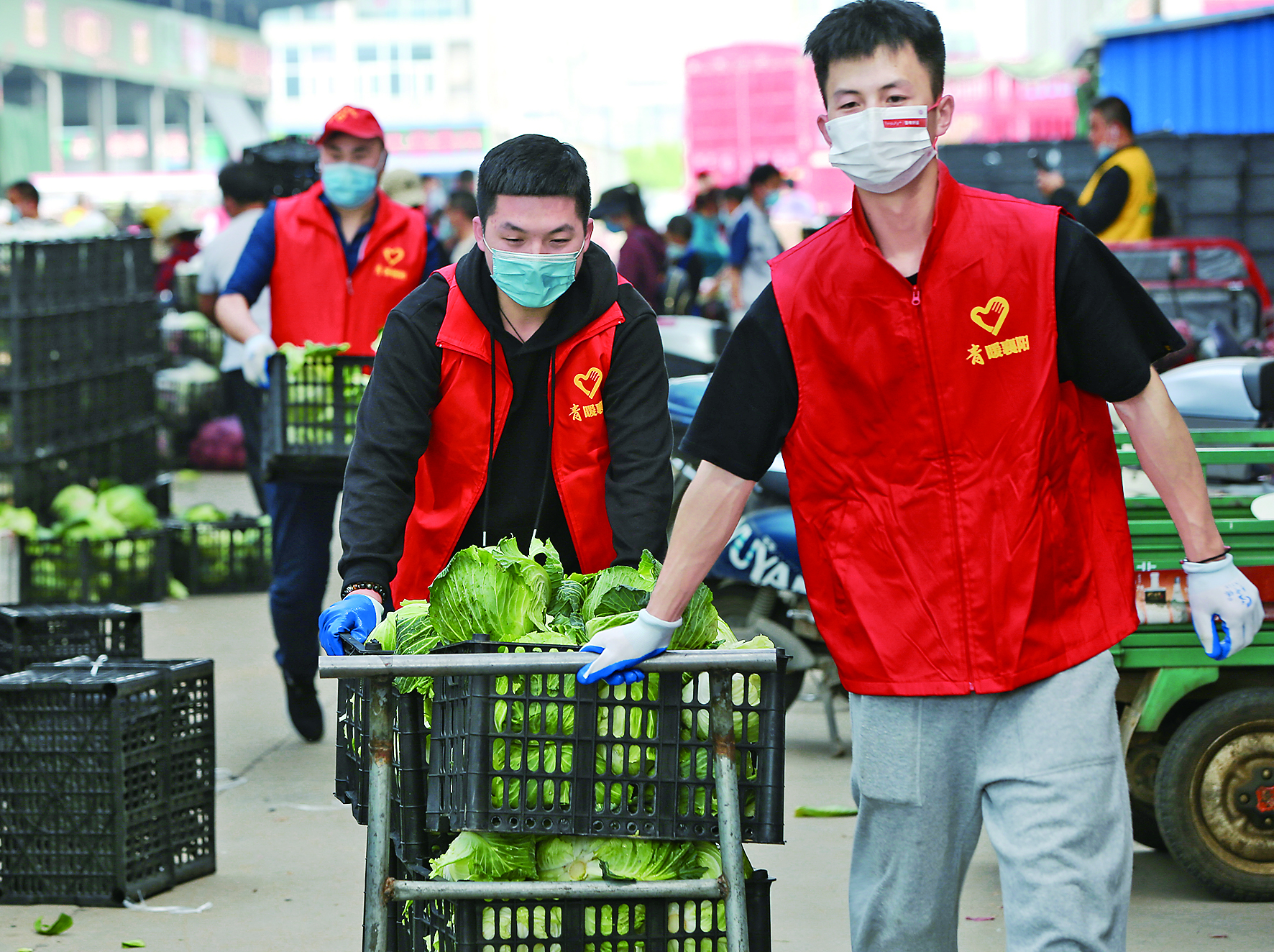 4月9日,在湖北省襄阳市竹叶山农产品交易中心,志愿者在分拣蔬菜。