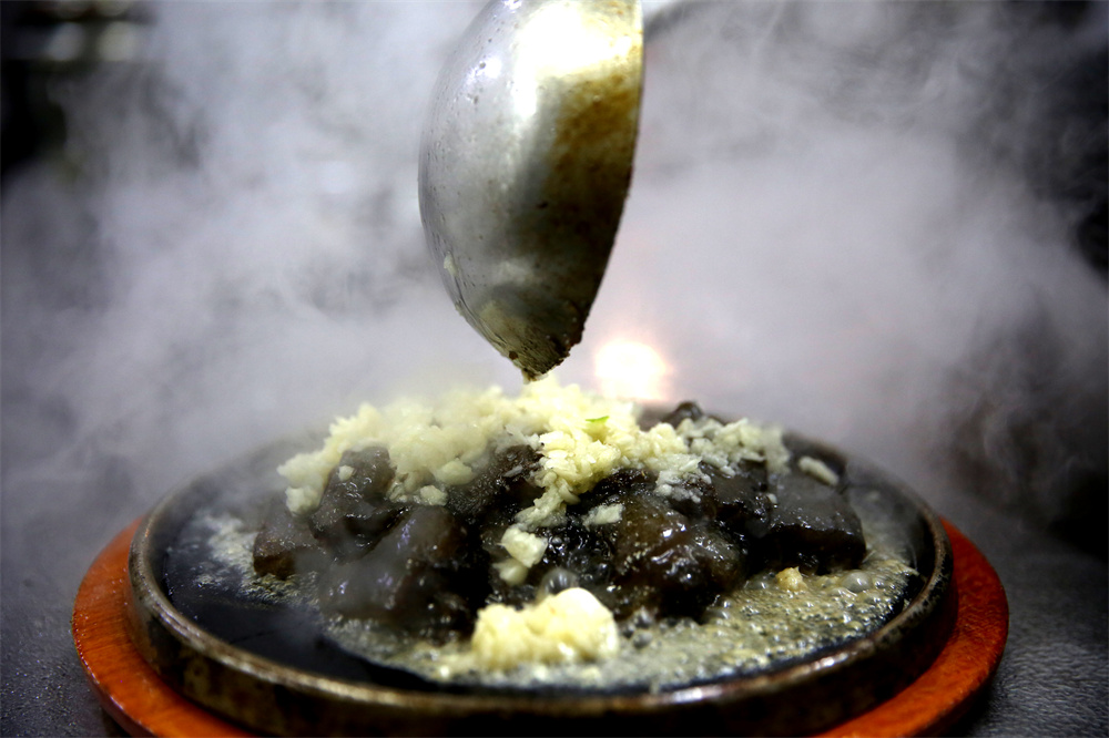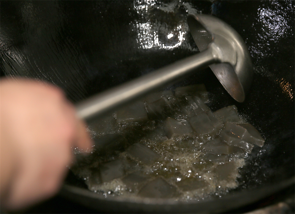 而炒凉粉又是另一种风味,它不仅色泽诱人、香味扑鼻,吃起来更是软糯香滑、入口即化。刚上桌的凉粉块冒着腾腾热气,在盘中堆成“小山”,像一个个漂亮的“宝石”。洒在凉粉块上的蒜末,更像是“珍珠”镶嵌在“宝石”上,把“宝石”点缀得格外绚丽。