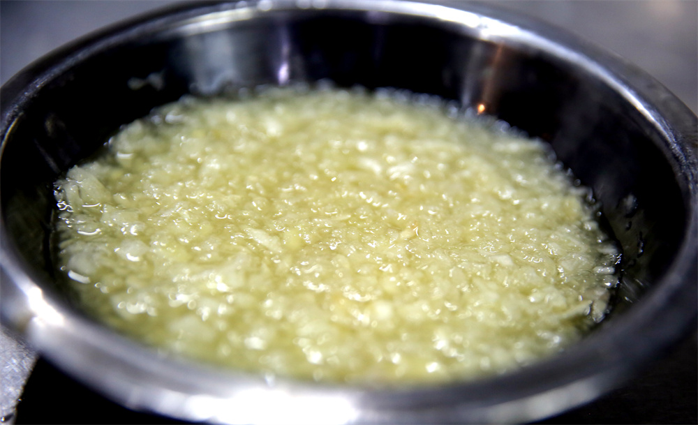最后,将炒好的凉粉,倒入提前烤热的石板上,再浇上捣好的蒜泥。这样一道软香鲜嫩、蒜香浓郁的油泼凉粉便制作完成。