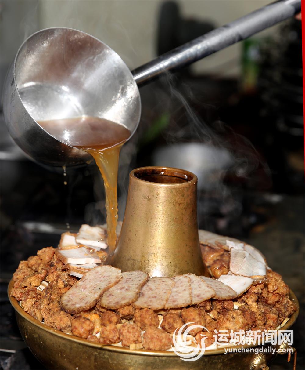 大白菜铺底,一层白豆腐、一层丸子、一层粉条、一层炸红薯、一层海带,把炸豆腐、五花肉片、排骨依次整齐地摆在最上层,最后将准备好的骨头汤,加入调味料搅匀浇在铜火锅里……这就是绛州铜火锅。铜火锅不断加热,汤汁会慢慢减少,旁边放一碗老汤,等吃到差不多的时候,直接添加进去。老汤溅到铜火锅上,发出“滋滋”的响声,就两个字——“舒服”。