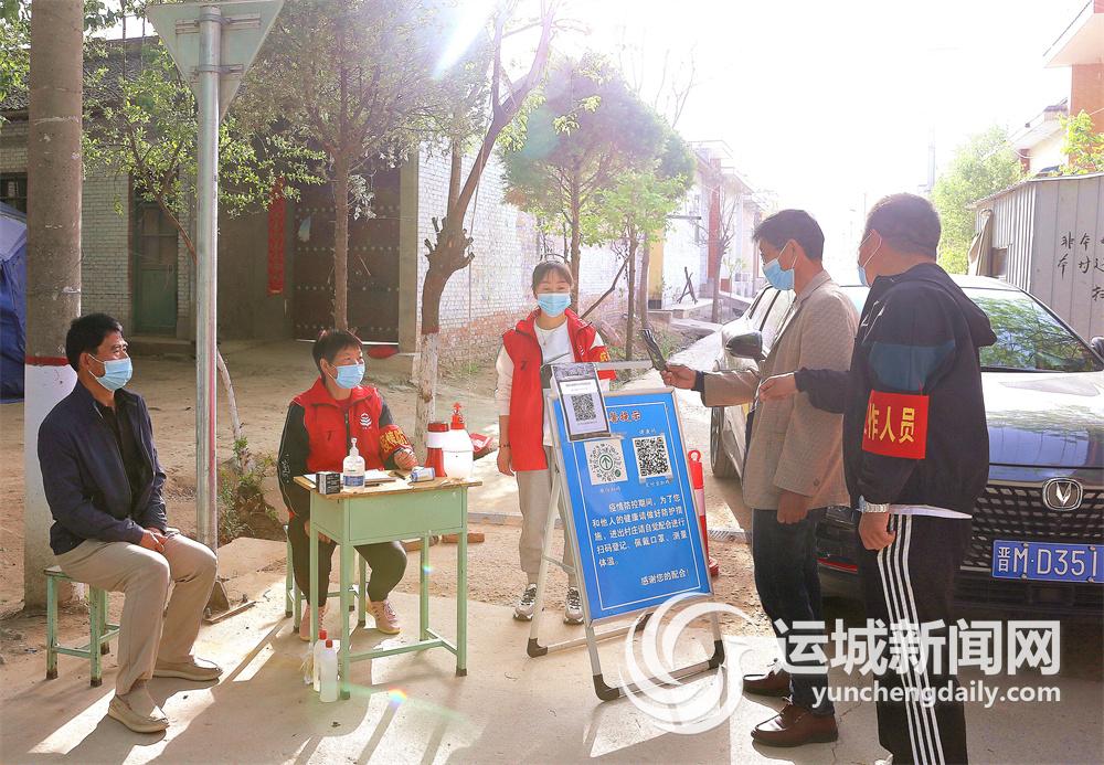 4月10日,夏县瑶峰镇下北师村孙保仙和儿媳王培霞与村干部一起在村口的疫情防控岗上值守。