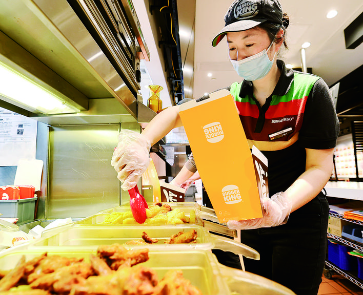 4月10日,汉堡王上海东阔生活广场店员工缪小梅在恢复营业的店内为网上订单打包。 近日,上海市政府结合疫情防控和物资保障实际需要,在严格落实疫情防控措施的前提下,按照分类管理原则,要求在封控区和管控区,超市卖场、连锁餐饮、药店等商业网点应开尽开,关门不停业,线上下单,线下理货,集订集送。要求在防范区,有限允许商业网点恢复经营,按照预约、限流原则开展经营活动。