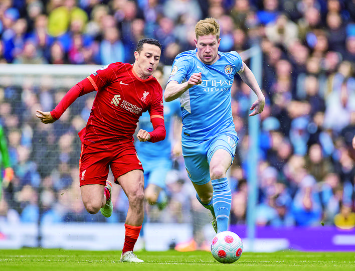 4月10日,曼彻斯特城队球员德布劳内(右)与利物浦队球员蒂亚戈·阿尔坎塔拉拼抢。当日,在2021~2022赛季英格兰足球超级联赛第32轮比赛中,曼彻斯特城队主场以2比2战平利物浦队。据新华社