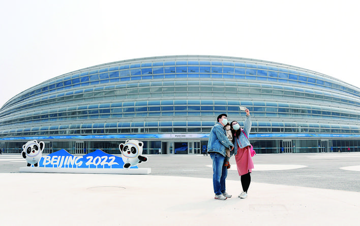 北京冬奥会上,历时5年建成的国家速滑馆“冰丝带”助力中外健儿屡创佳绩,广大场馆建设者功不可没。4月10日,场馆暖心邀请建设者代表及家属“回家看看”,共同分享这份冬奥荣光。 10日上午,“冰丝带”赛时照明全开,给予“家人”最高礼遇。在做好防疫前提下,场馆设计、施工、制冰、监理等领域的建设者代表及家属走进场馆,大家相互问候、拍照打卡,体验见证荣耀的“最快的冰”。 建设者张博伟(左)与家属在国家速滑馆“冰丝带”外合影留念(4月10日摄)。