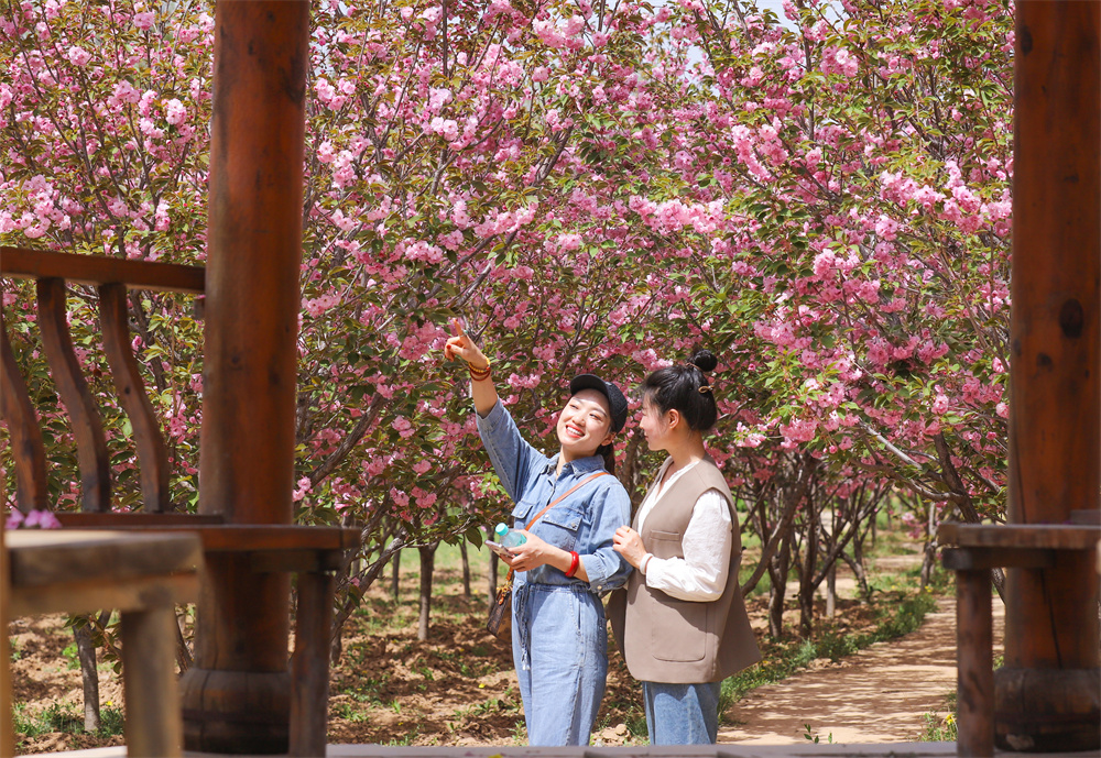 4月9日,在夏县堆云洞景区附近的一绿植公园内,上千株樱花树正值盛花期,形成花的海洋。