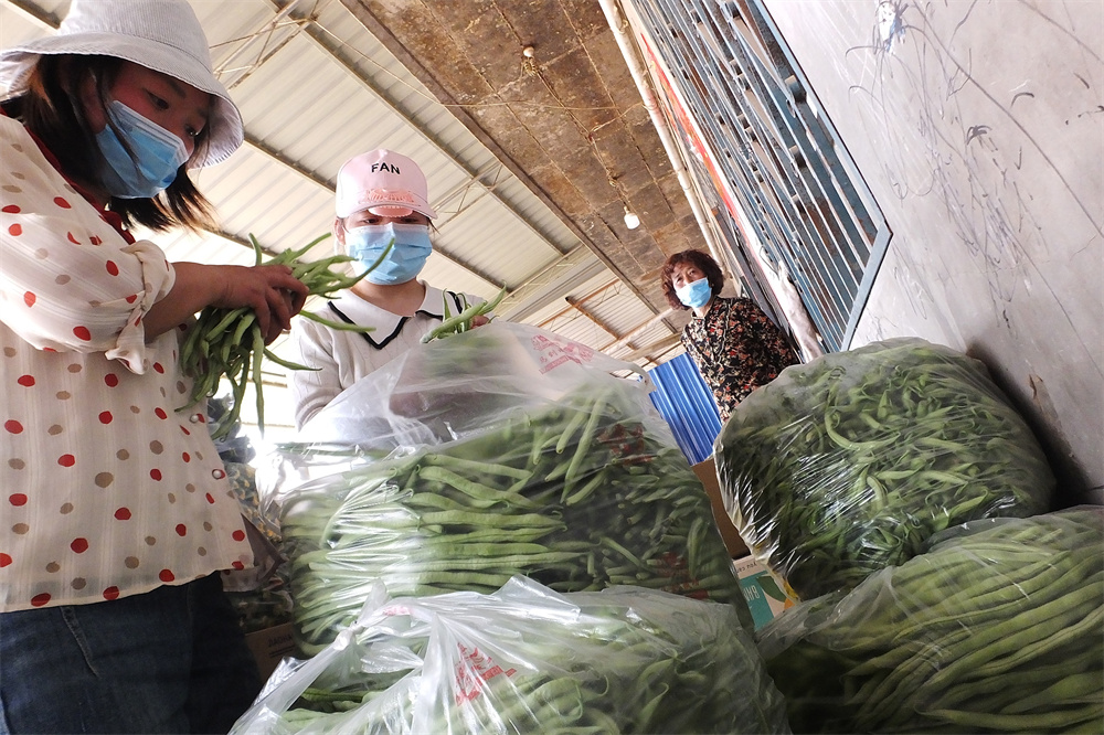 菜农在新绛县泉掌镇南张村蔬菜批发市场装袋外销收获的豆角。