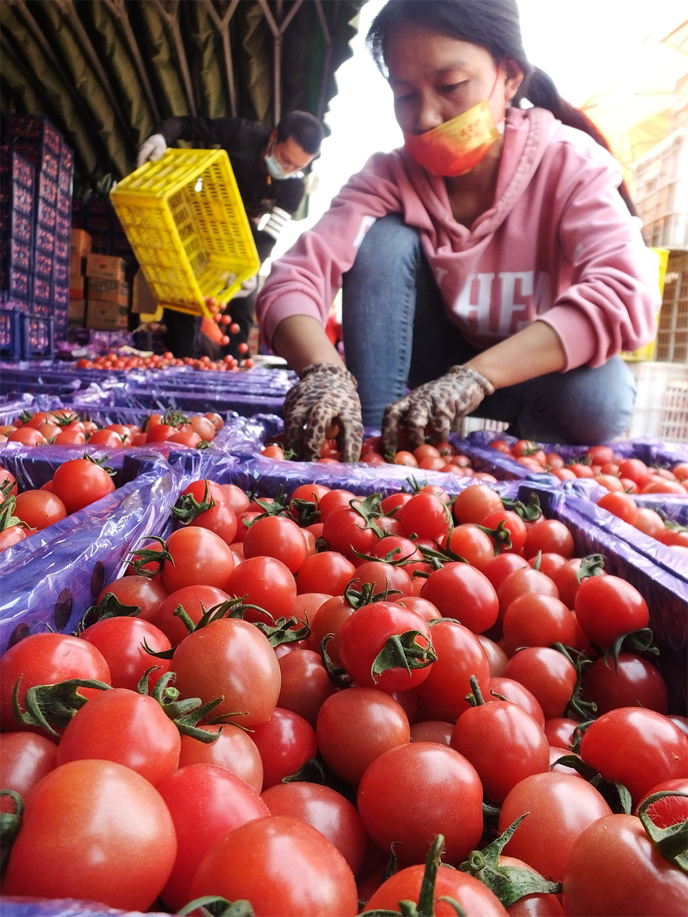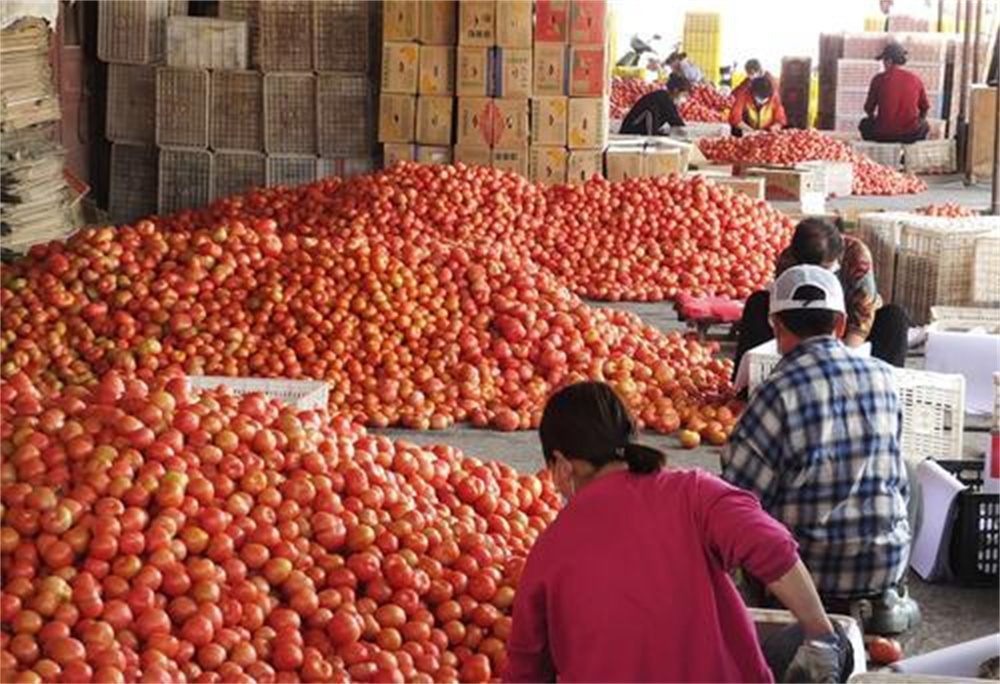 菜农在新绛县泉掌镇王守庄村蔬菜批发市场分拣装箱收获的西红柿