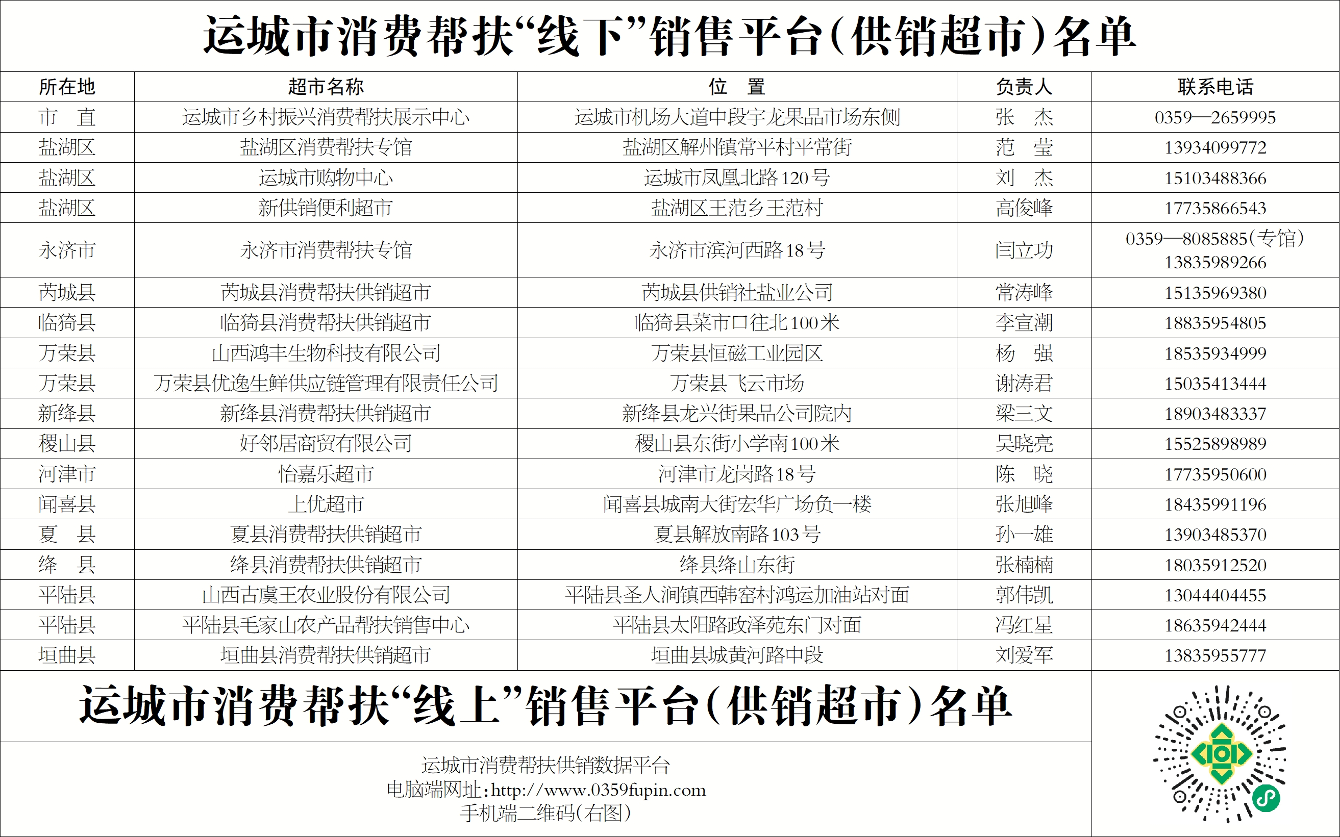 为深入贯彻习近平总书记关于实施乡村振兴战略的重要指示精神,落实省委、省政府全方位推动高质量发展的决策部署,按照市委、市政府关于《全市巩固脱贫成果推进乡村振兴“五项重点百日攻坚”专项行动方案》文件要求安排,进一步深化消费帮扶机制、拓展消费帮扶渠道,促进我市脱贫地区农产品流通和产销精准对接,全面提升消费帮扶工作成效,特将全市消费帮扶18家“线下”销售平台和1家“线上”销售平台面向社会公示,接受社会监督,监督电话:0359-2655822,名单如下。