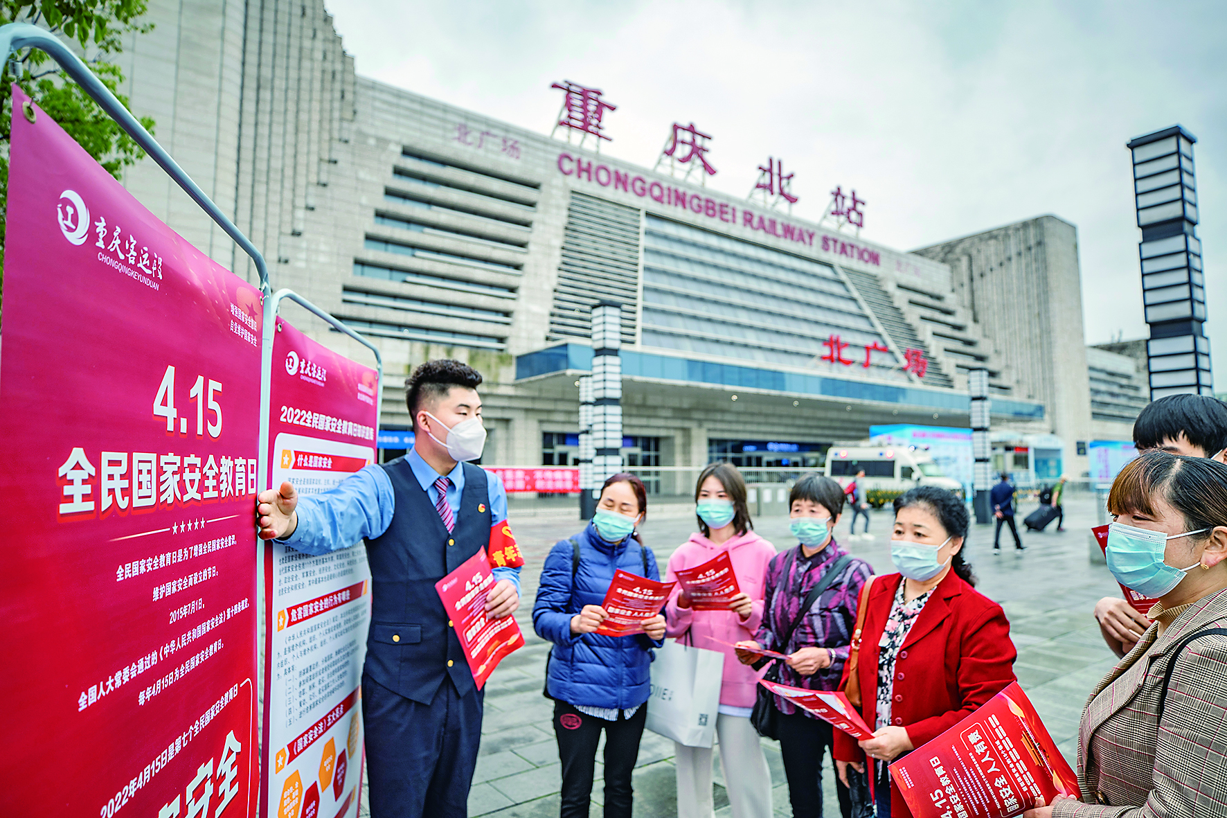 右下图为4月14日,在重庆北站北广场,中国铁路成都局集团有限公司重庆客运段青年职工志愿者为旅客宣讲防范化解危害国家安全行为的小知识。 (新华社记者 黄 伟 摄)