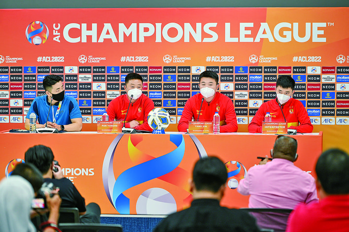 4月14日,中国广州队主教练潘勇赫(左二)与球员杨鑫(右二)在新闻发布会上。 当日,2022赛季亚洲足球冠军联赛I组举行赛前新闻发布会。Ⅰ组比赛将于15日在马来西亚新山开赛,中国广州队将在首场比赛中对阵马来西亚柔佛新山队。