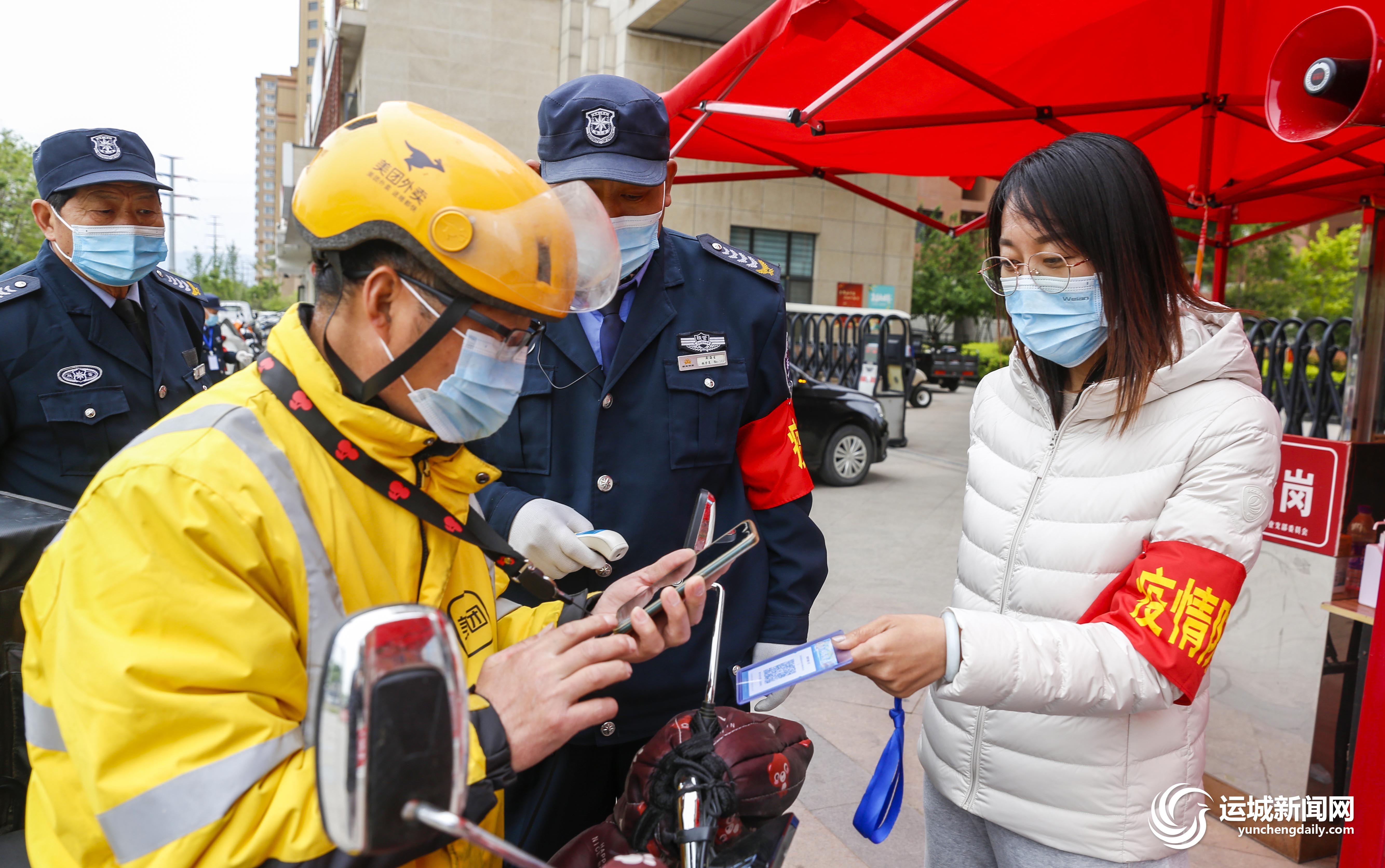 4月15日,盐湖区安邑街道金海湾社区御景华庭小区疫情防控值守卡点,市住房公积金管理中心下沉干部郭瑞春与小区保安在查验外卖员的场所码。