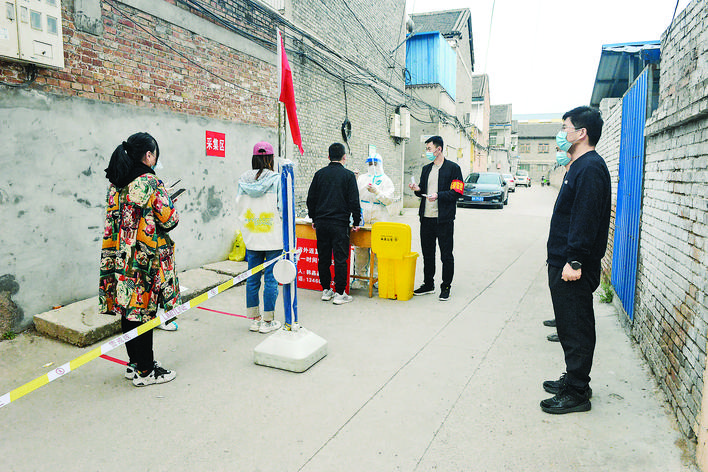 ▲4月15日,在夏县新一轮核酸检测中,夏县供电公司6名青年志愿者到地税社区,主动担负秩序引导、信息采集等任务,助力核酸检测工作,用实际行动践行“奉献、友爱、互助、进步”的志愿服务精神。(梁保国 摄)