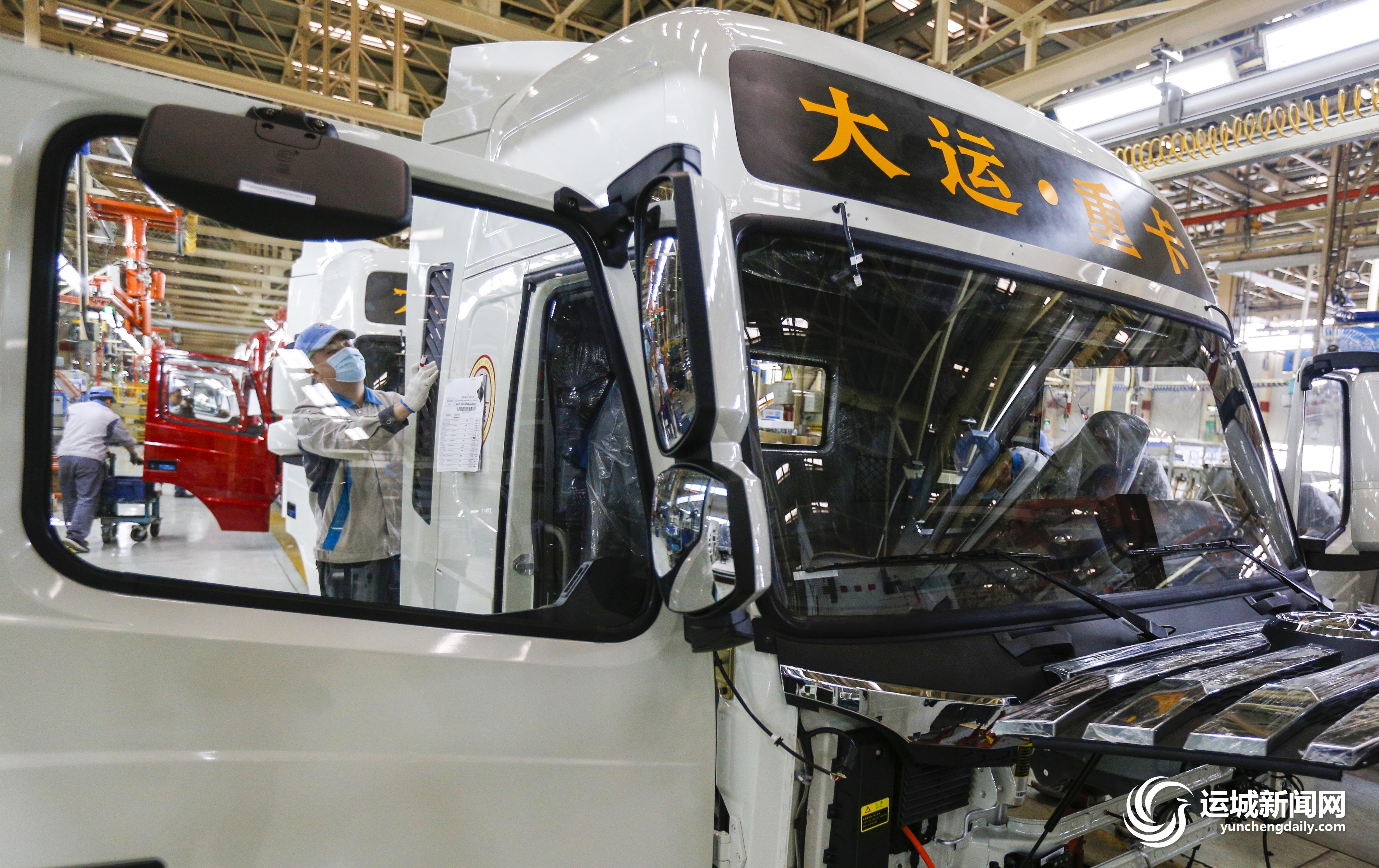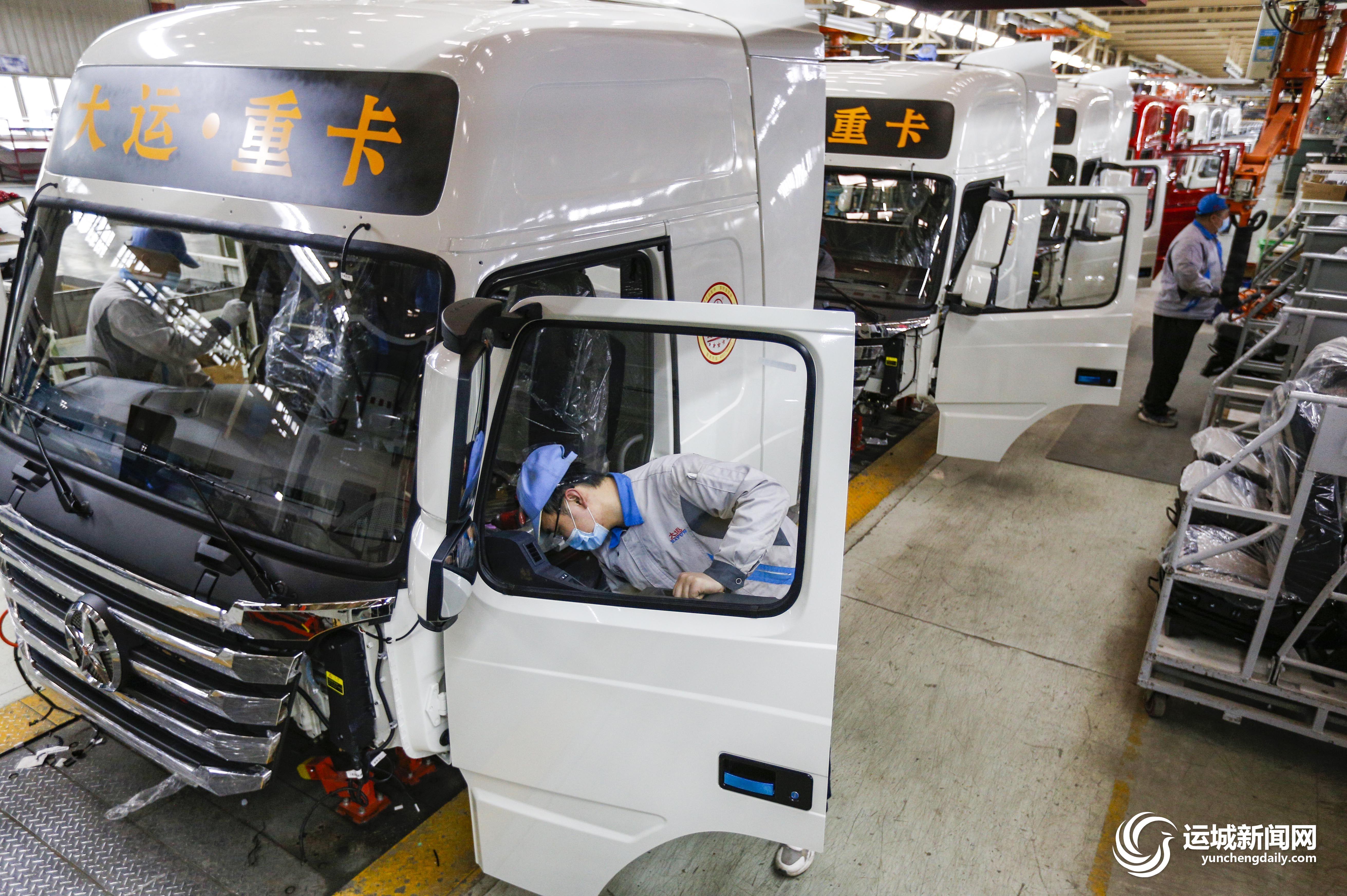 4月15日,大运汽车股份有限公司总装车间员工在加紧生产新能源重卡。