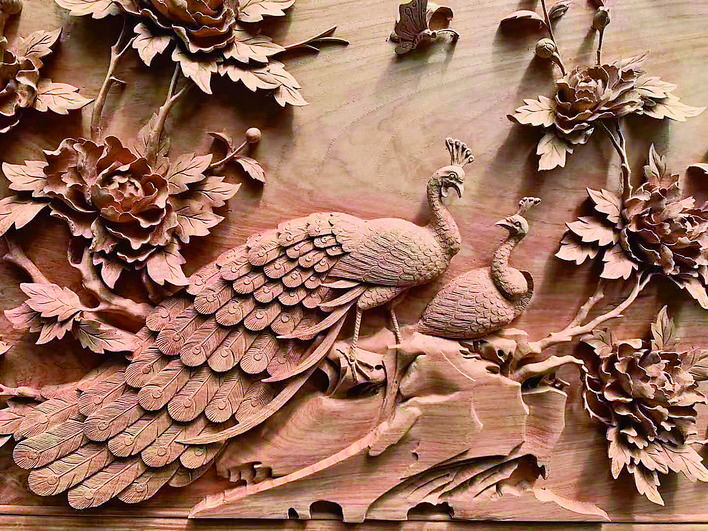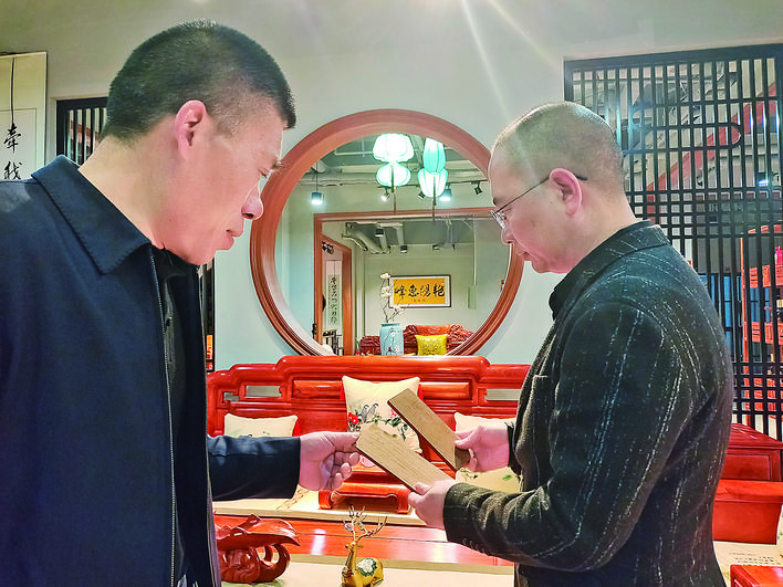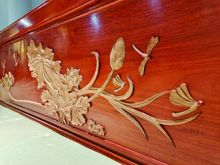 在博瑞红木家具展厅,摆放着一款“幸福”大床,整床由缅甸花梨木制作而成,床头雕刻着“喜上梅梢”图案。“这个图案寓意家有喜事、小两口恩爱和睦,多适用于刚结婚的新人房间。”程先生说,展厅还摆有“团圆”“和谐”等大床,将中国传统文化元素通过浮雕、机雕等工艺,雕刻成各式各样的纹路、图案,融入床体,具有美好寓意和祝福,深受消费者喜爱。