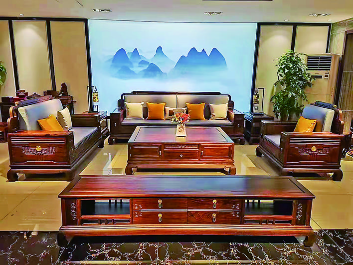 博瑞红木家具运城店负责人程先生介绍,考虑到本地气候特点,该店销售的红木家具以大果紫檀(俗称“缅甸花梨木”)和刺猬紫檀两种红木材料为主。在制作时,博瑞红木家具的工匠最大限度地去除木材边角框料,取芯料进行加工,更凸显红木家具的价值。