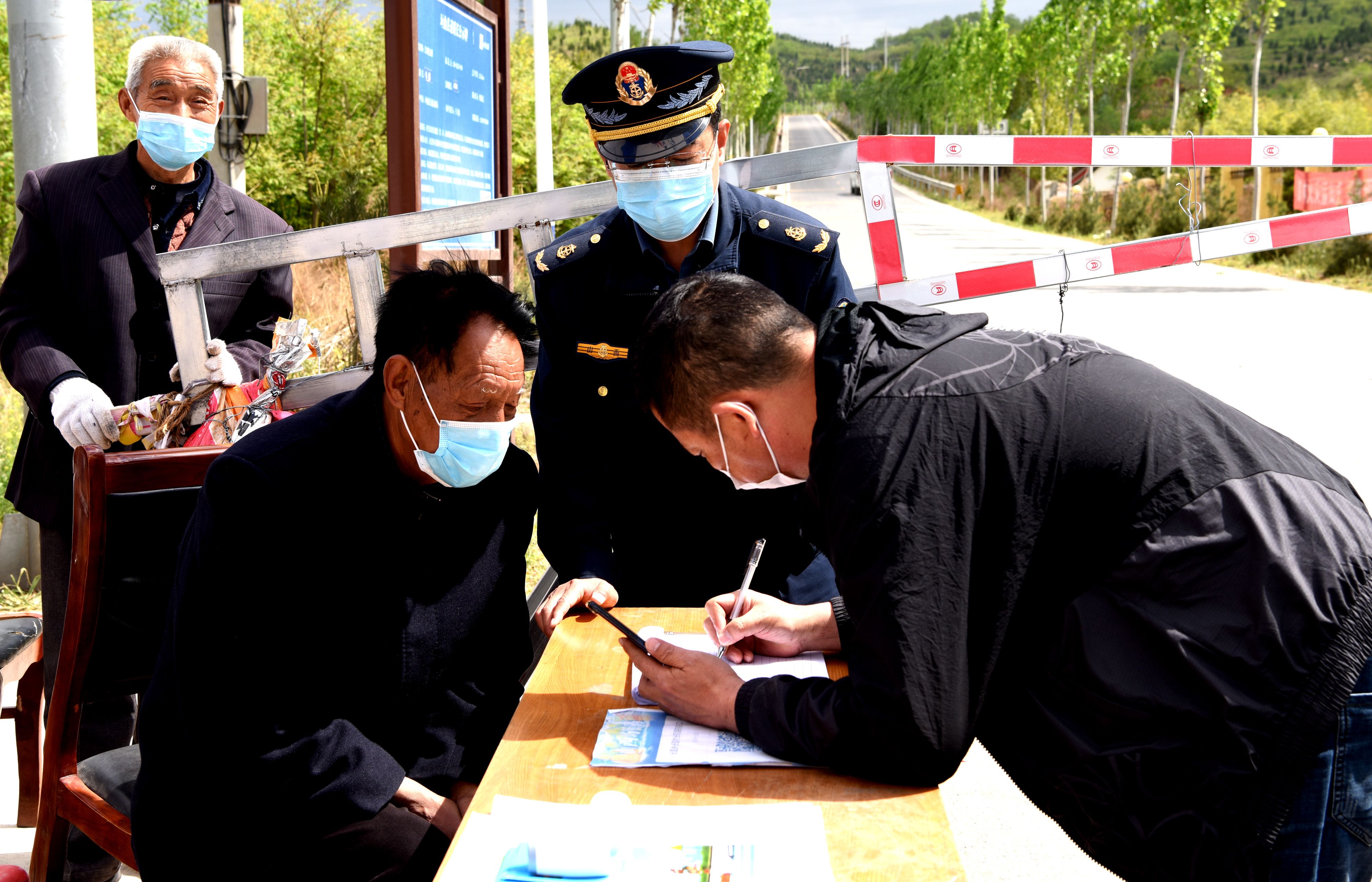 4月18日,运城公路分局垣曲超限检测站执法人员,在垣曲县长直乡长直村疫情防控卡口义务值勤。