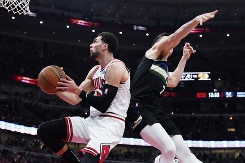 4月24日,公牛队球员扎克·拉文(左)在比赛中上篮。当日,在2021~2022赛季NBA季后赛东部首轮第四场比赛中,密尔沃基雄鹿队客场以119比95战胜芝加哥公牛队,以总比分3比1领先。 新华社/美联