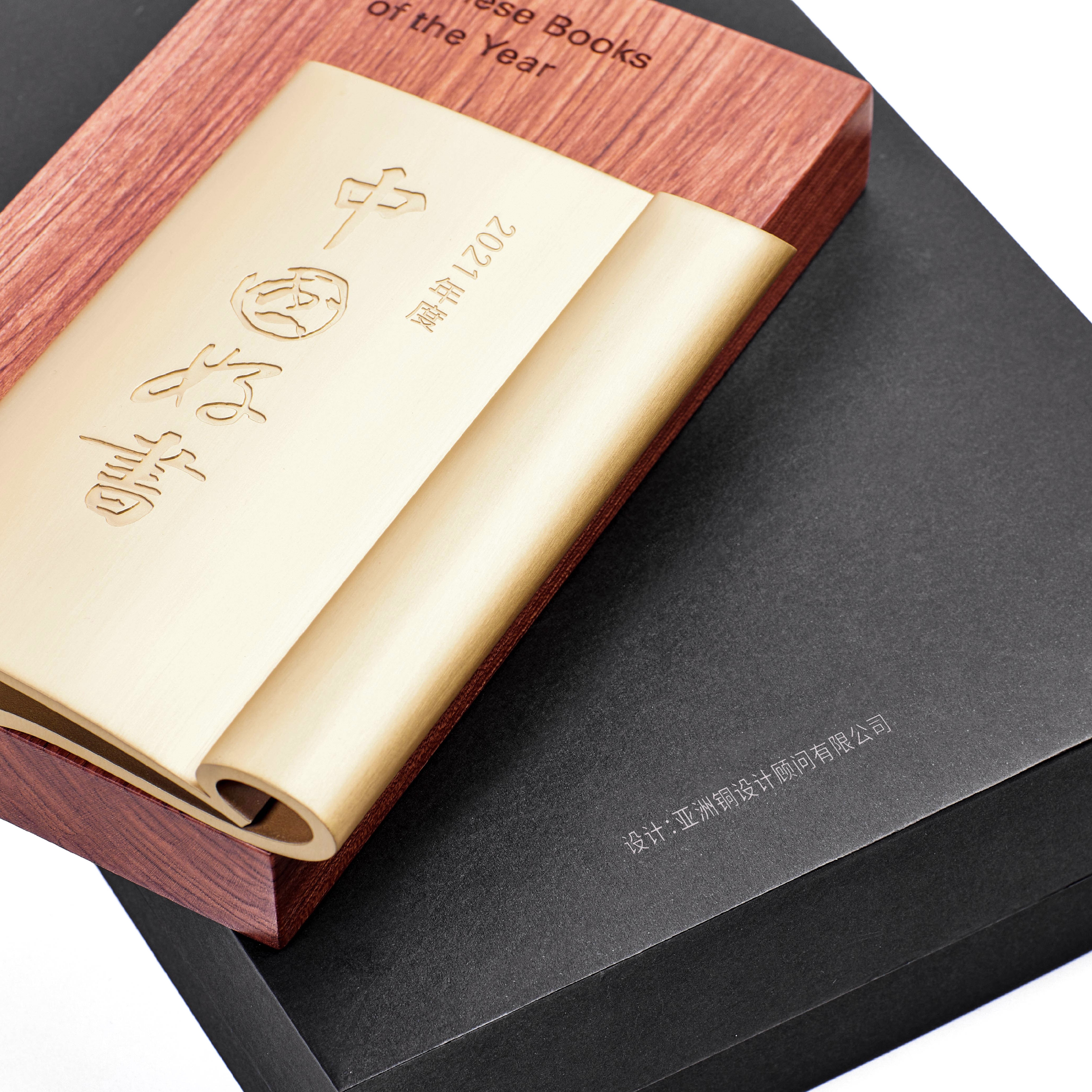 该盛典颁奖奖杯被命名为“中国好书”,蕴含着中华文明源远流长、书香永存的意义。奖杯以长方体的棕红色木板为底,其上承托一本已翻开的黄铜色书卷,如同案边一本竖立而放的书卷。书卷上竖刻有潇洒飘逸的“中国好书”四个大字,一旁刻有“2021年度”标识。书卷中间的“中国好书”书法字体汲取了苏轼的书法,书卷选取中国线装书,翻页方式为向右翻开,极具书卷气并蕴含着中国古典文化;其余刻字则采用现代印刷体,展现出历史与现代相交织的设计意境,可视为是对中华文化历程的另一种见证和阐释。