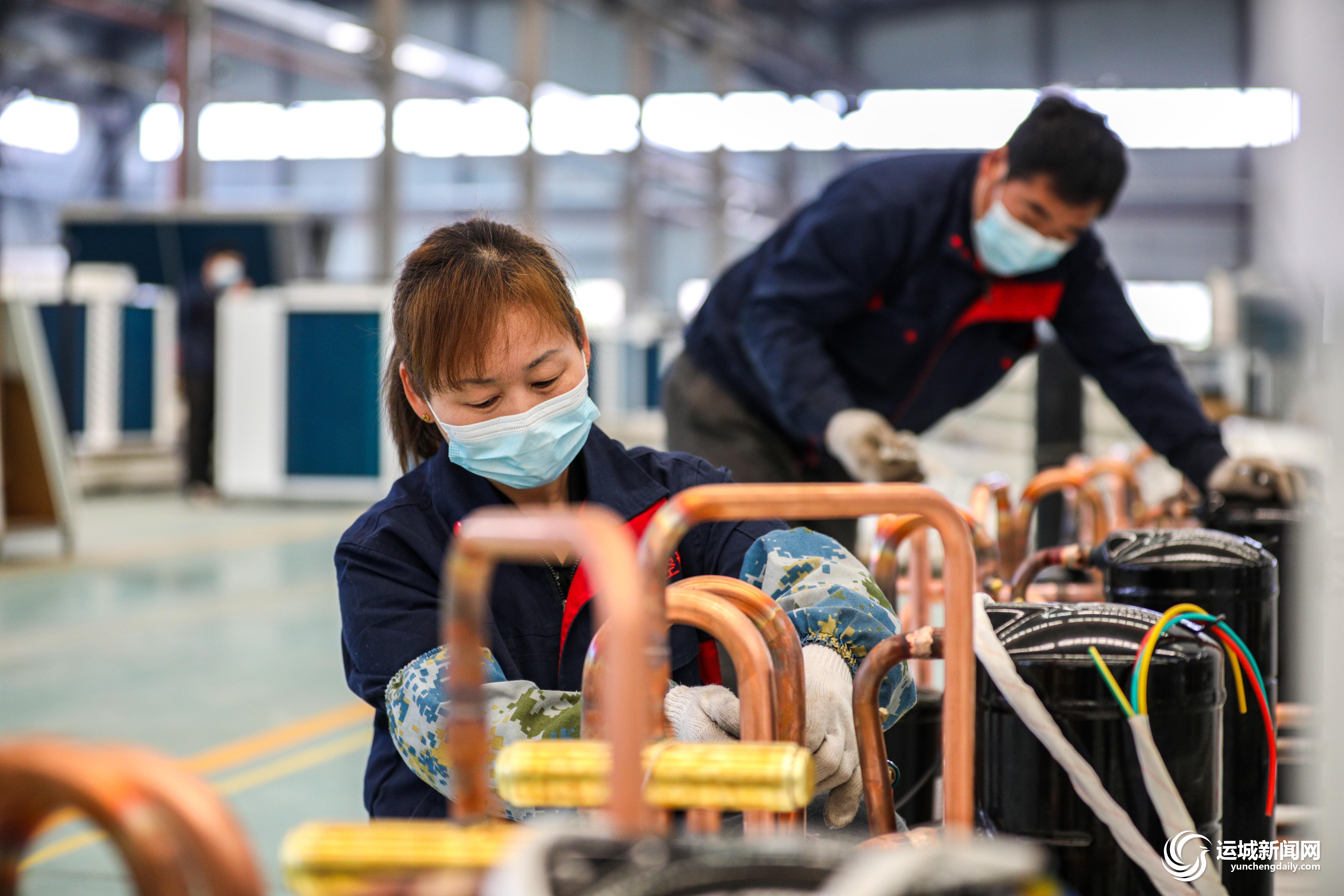 4月22日,在位于盐湖高新区的耐卡恩(山西)新能源制造有限公司,工人在加紧生产方舱医院专用空调设备。