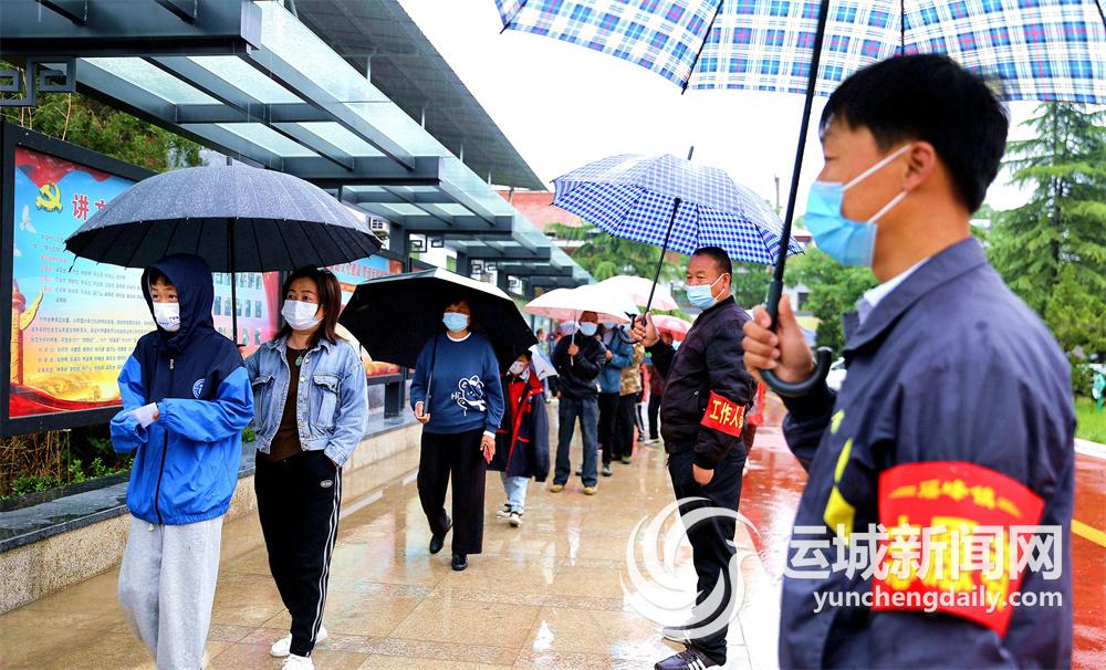 4月28日,夏县瑶峰镇郭道村村民冒雨排队接受核酸检测。