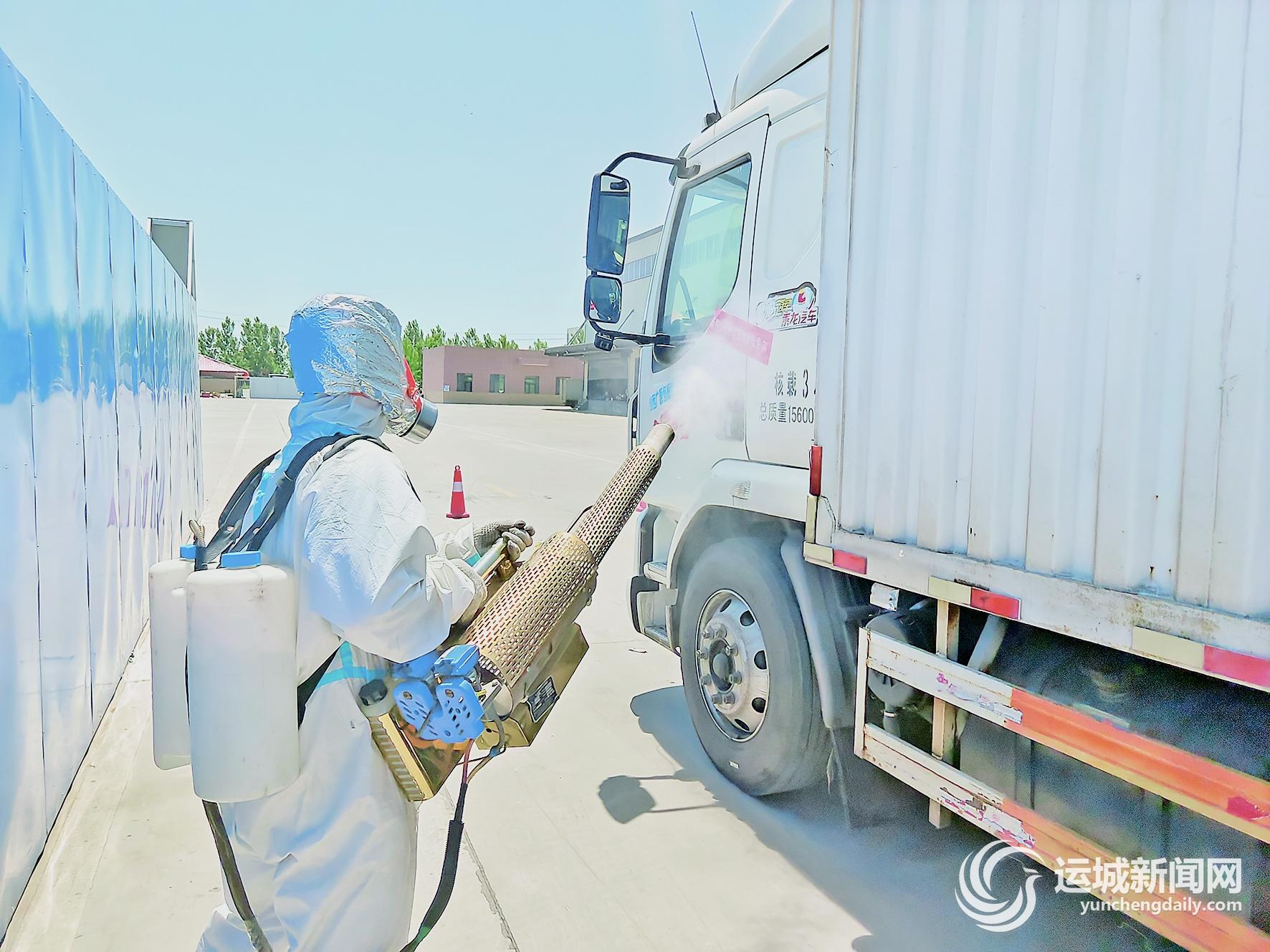 顺丰运城楚侯中转场,工作人员对卸完货的车辆进行消杀。 裴旭薇 摄
